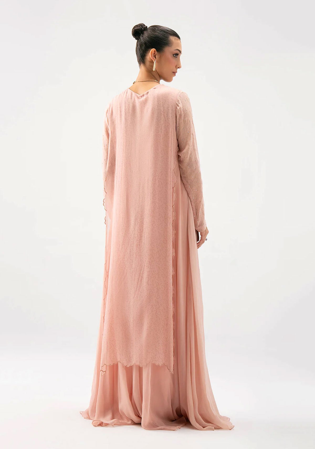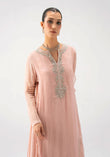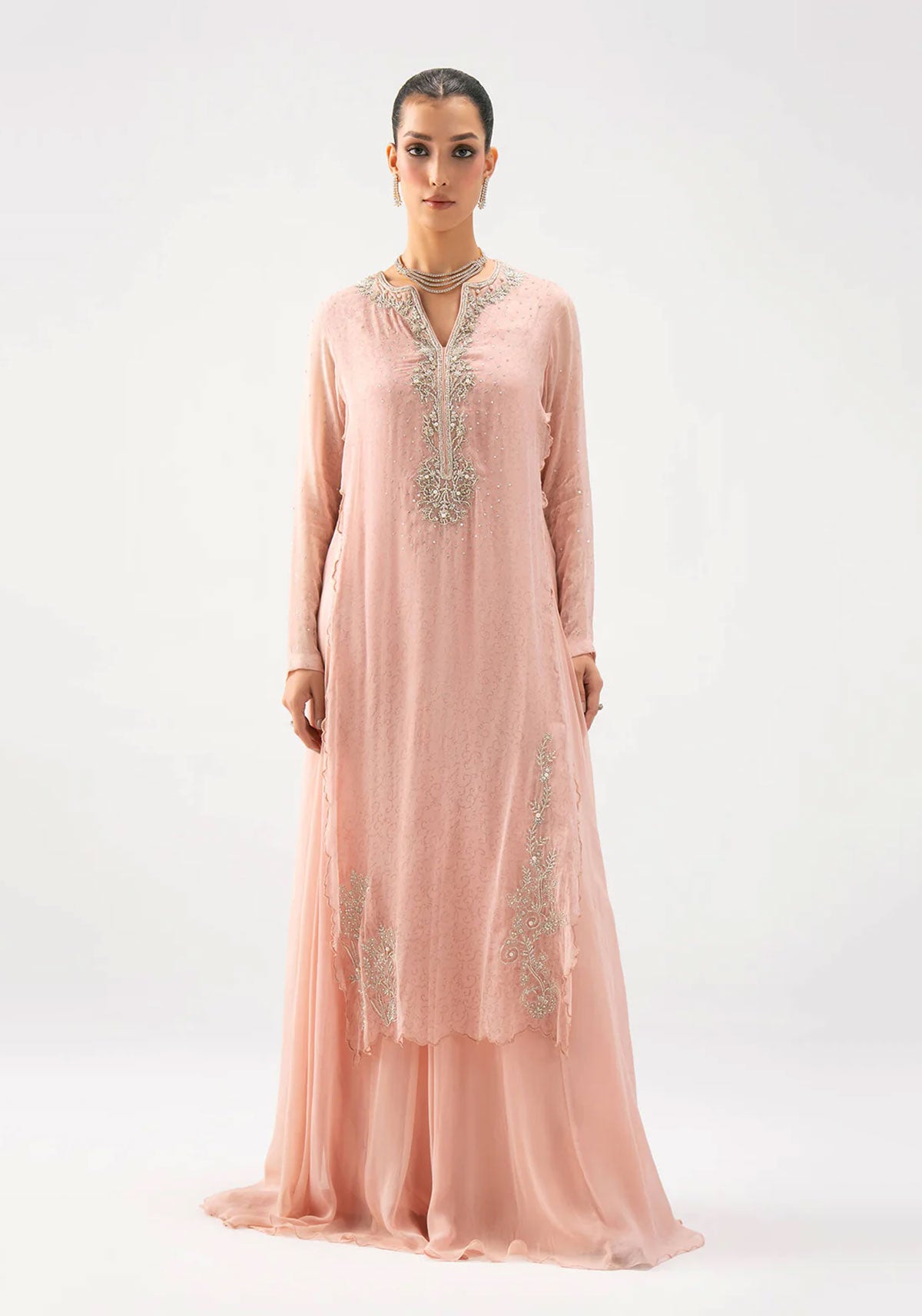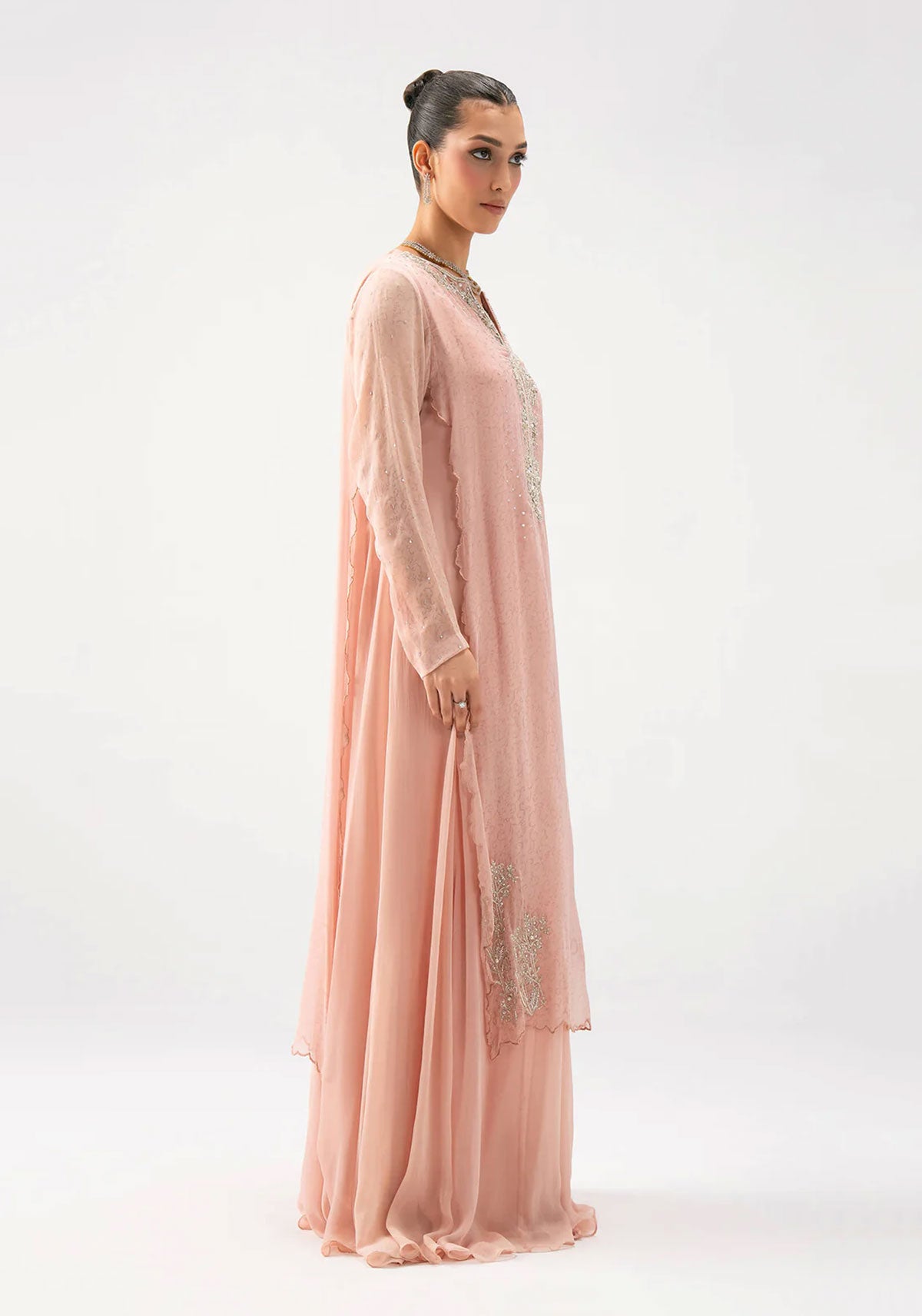 The long flowing dress is designed in a delicate chiffon peach tone, beautifully embellished with hand embroidery in silver zari, sequins, and pearls. The intricate detailing along the neckline and hem adds a graceful shimmer, while the soft fabric drapes with fluidity, exuding effortless charm.