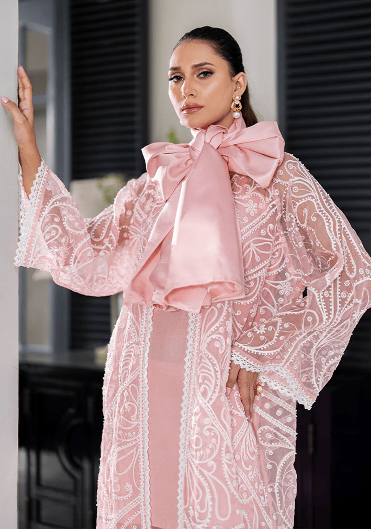 Pink Organza Pearl Embellished Coat with Slip and Trousers