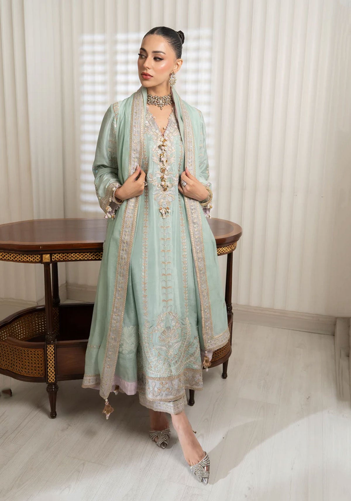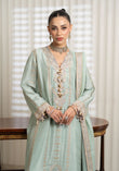This exquisite outfit is a testament to fine craftsmanship, featuring a pure rawsilk shirt in a serene shade. The shirt is lavishly adorned with gold and silver tilla embroidery, and further embellished with handmade sequins and beads tassels. It is paired with pure Korean rawsilk trousers that showcase elegant tilla borders. The ensemble is gracefully completed by a pure khaadi net dupatta with matching tilla borders and finishing.