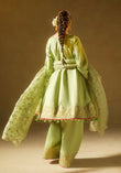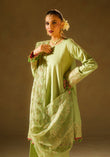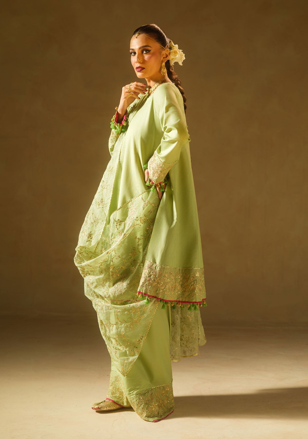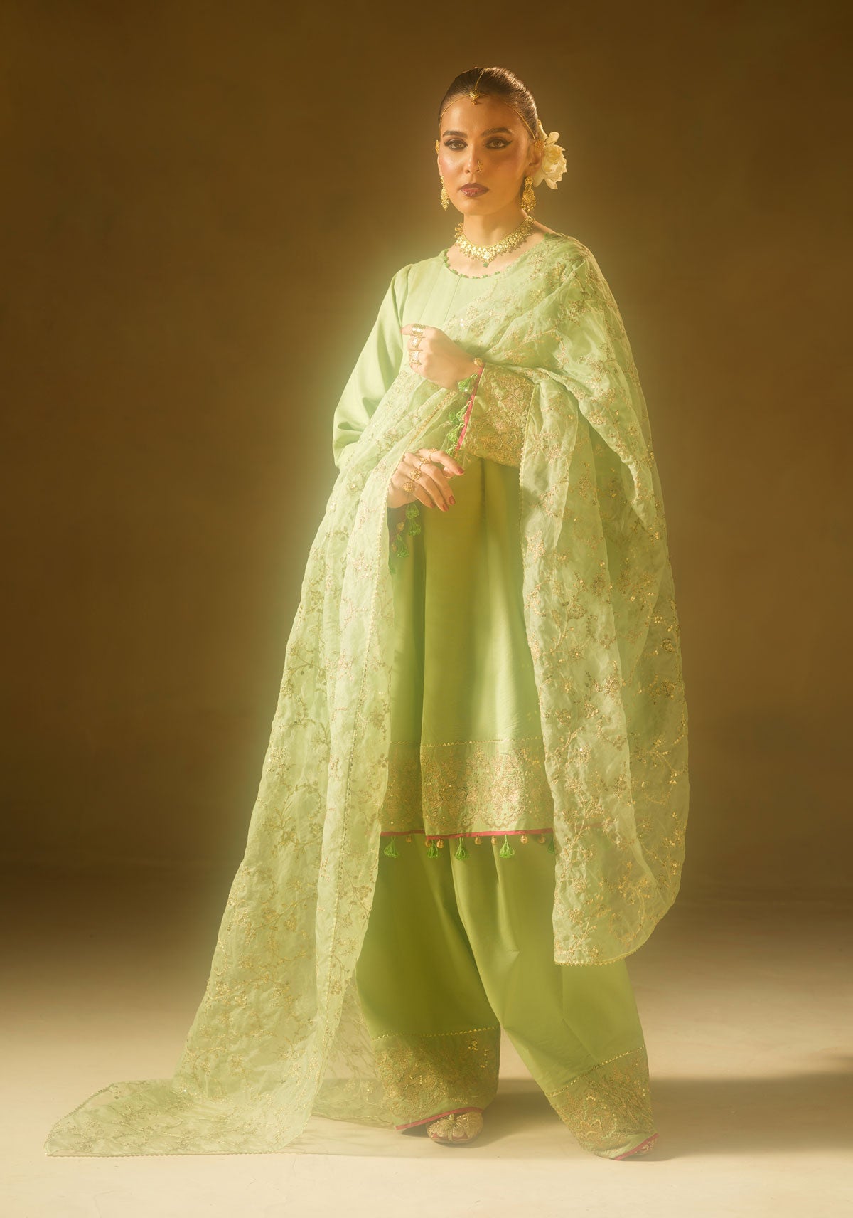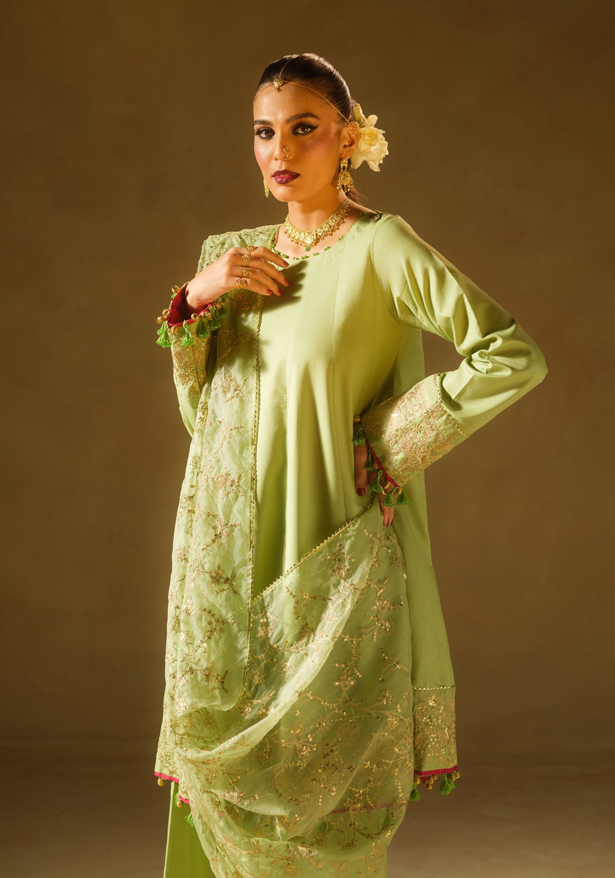 A pistachio green ensemble featuring a short flared shirt with intricate embroidery on the sleeves and hem. Paired with a matching shalwar, adorned with delicate embroidery on the hem, this look blends tradition with effortless grace.