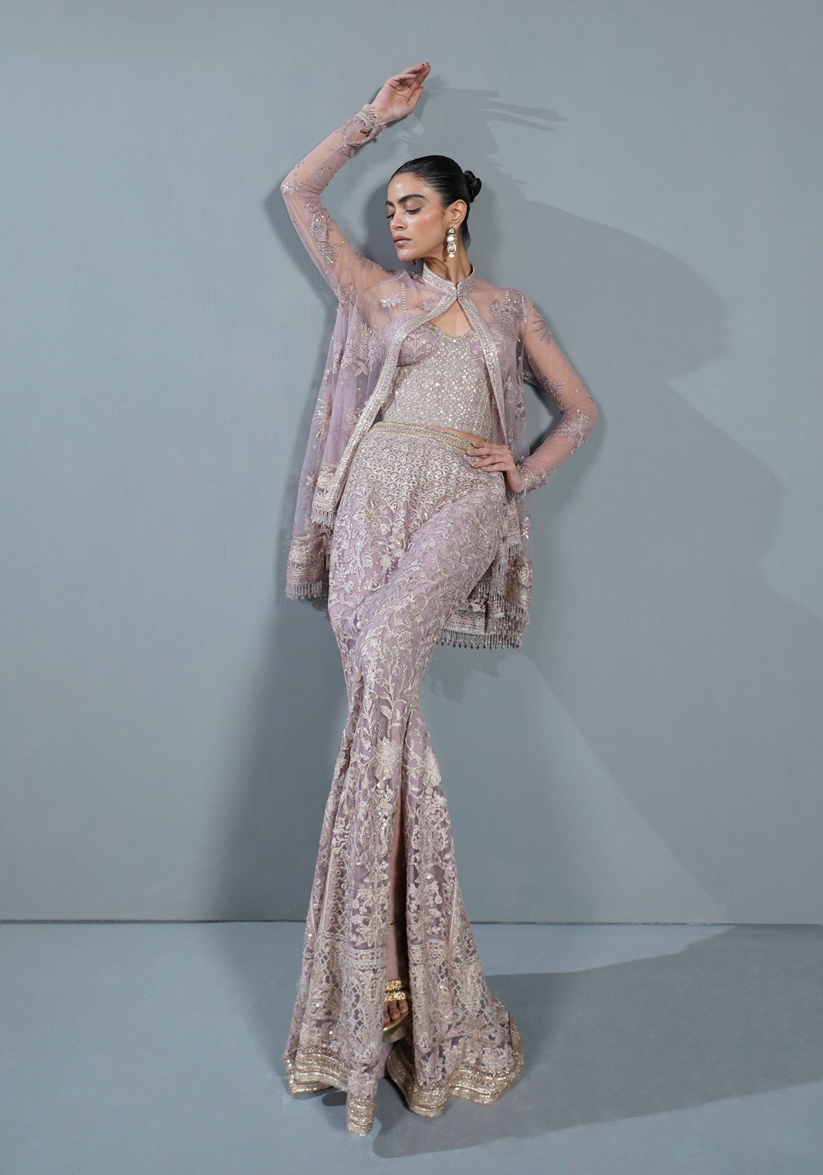 Embroidered smokey rose ensemble featuring a bustier supported by lace straps, worn under an embroidered cape accessorised with bead hangings, paired with a fully embroidered mermaid skirt with a side slit.