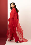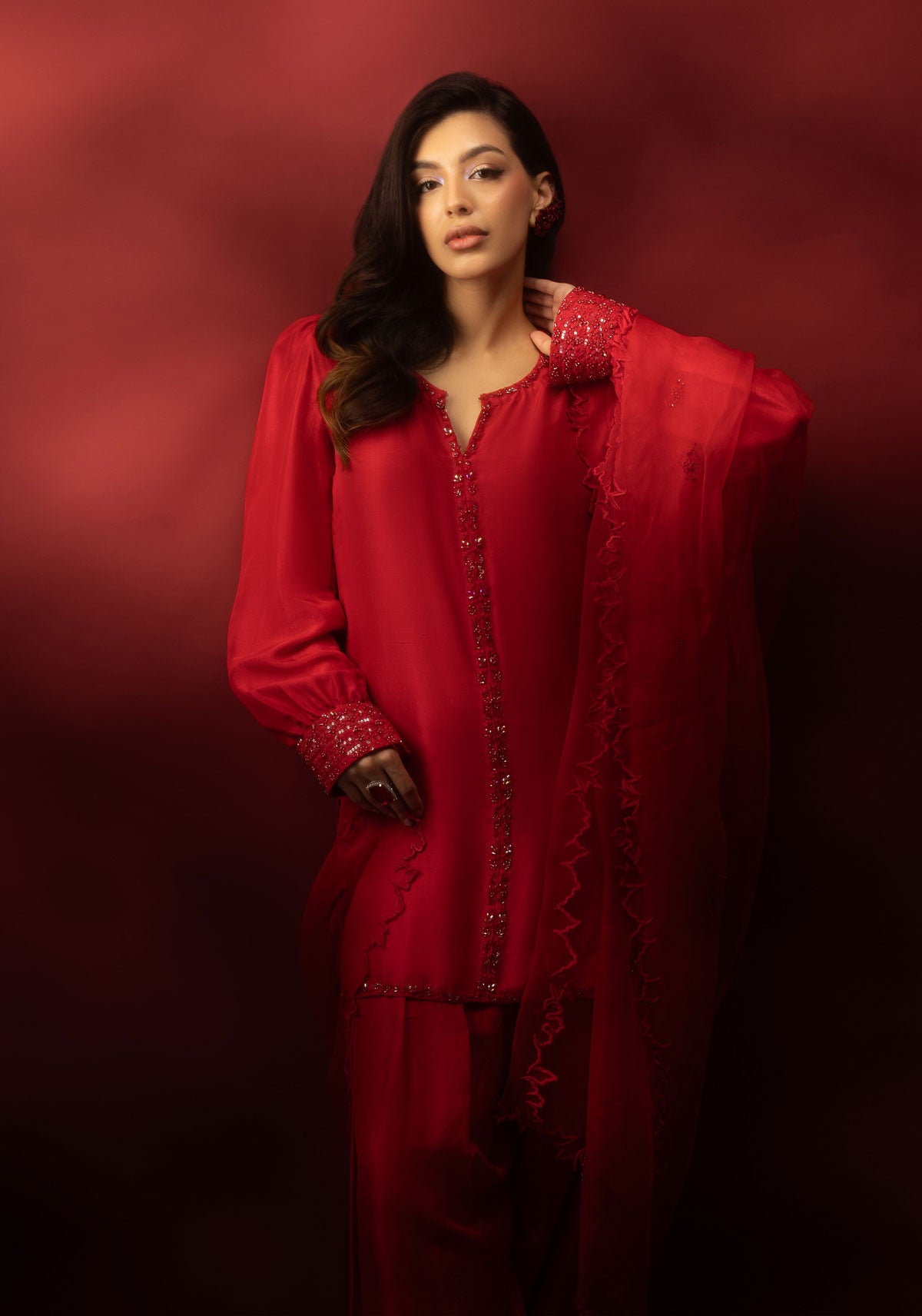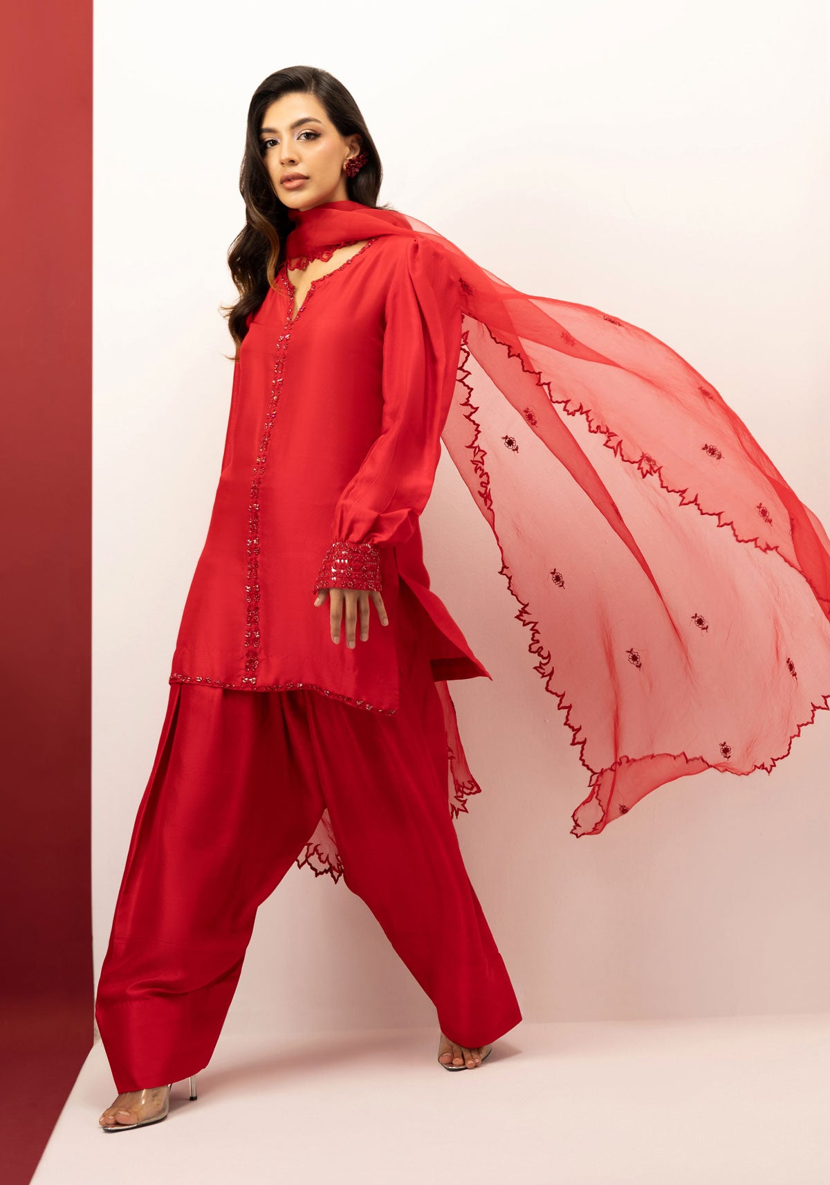 'Timeless glamour, for those who want to make an impact. The Poppy Set will make you stand out cut from the finest fabrics detailed with luscious intricate embroidery with crystals and beads. Paired with a stunning dupatta with embroidery detailing’s and crystals, Paired with a farshi shalwar. Model height is 5’6 and is wearing 3 inch heels. Shirt length is 32.