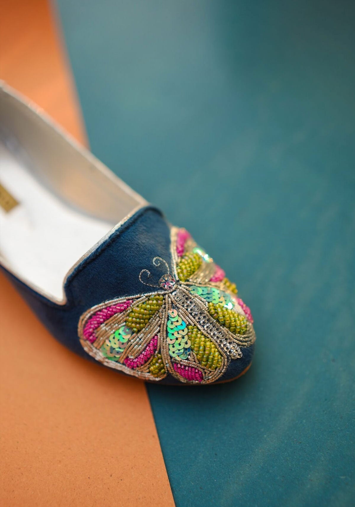Step out in style with these playful pumps featuring pale blue soft micro velvet trimmed with sparkling silver glitter rexine piping. A hand-embroidered butterfly bursts with colorful sequins, silver dabqa, cut pipes, and beads, adding a whimsical touch. The sparkling silver sole and lining catch the light with every step, while the cushioned upper and insole ensure comfort. Finished with a lightweight, flexible crepe sole, these pumps are perfect for dancing through your day with effortless flair.