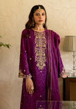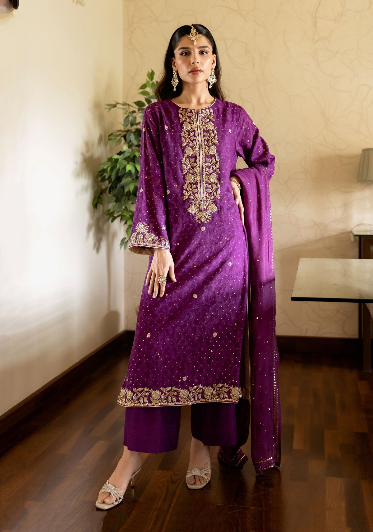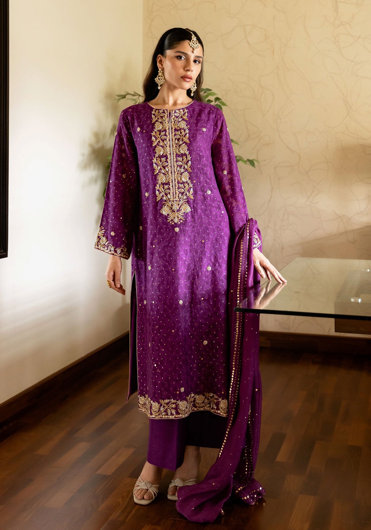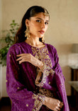 Purple Reign is rendered in a striking shade of purple with fine quality needle craft in antique gold & silver zardozi embroidered borders & motifs with dispersed gold kamdani. It is paired with a pure khaddi net dupatta with kamdani borders & chan & matching silk ejaar. This piece is a perfect addition to your festive armoire.
