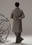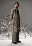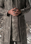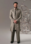 A midnight grey organza sherwani fully embellished and embroidered with floral patterns infused with intricate linear motifs on the base