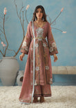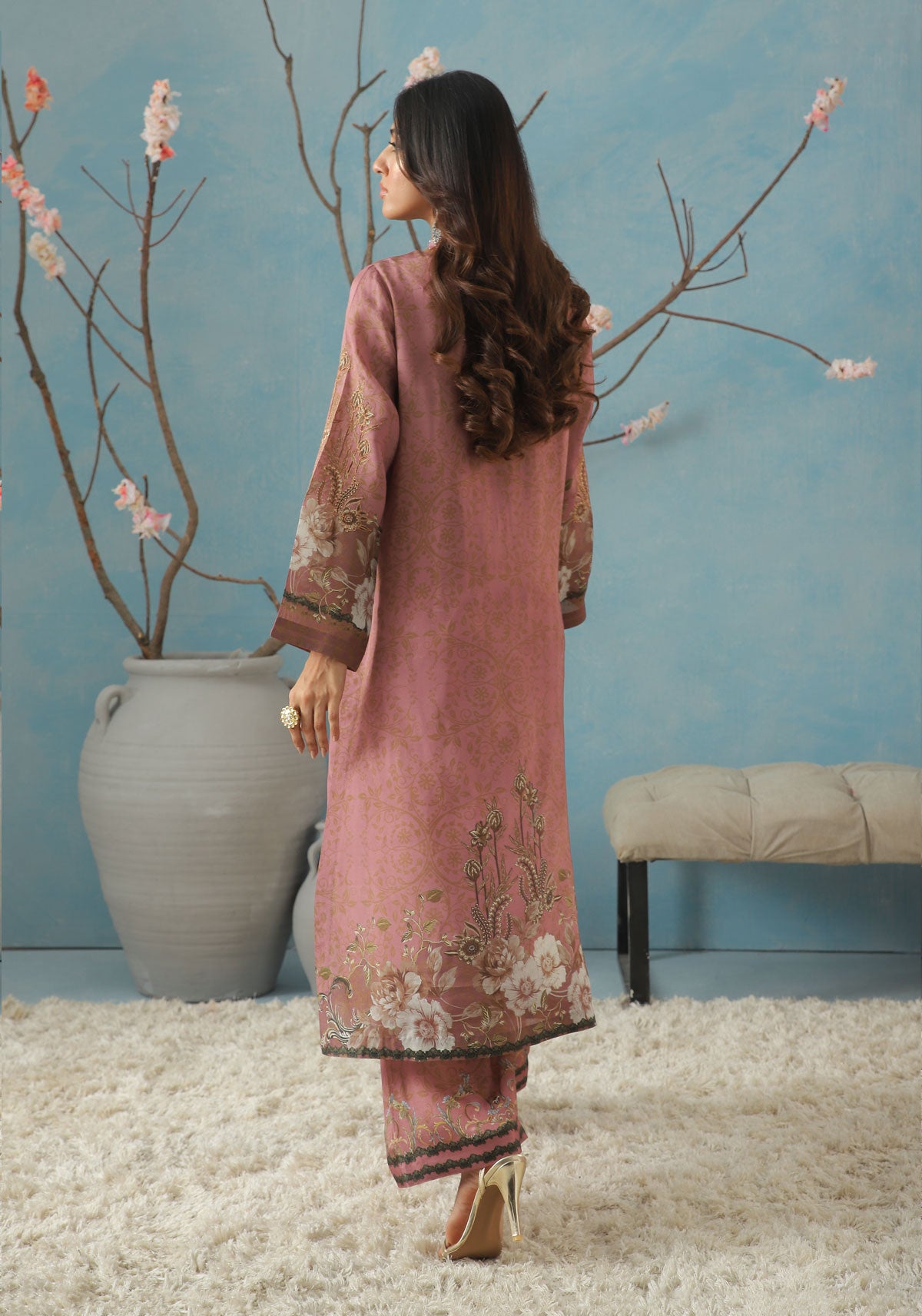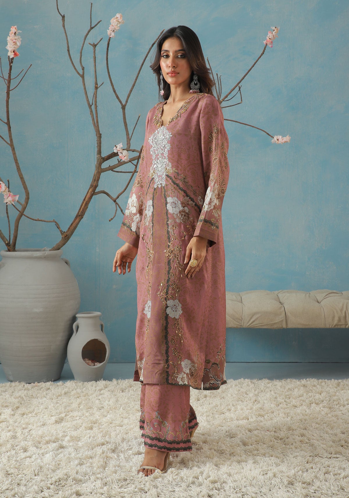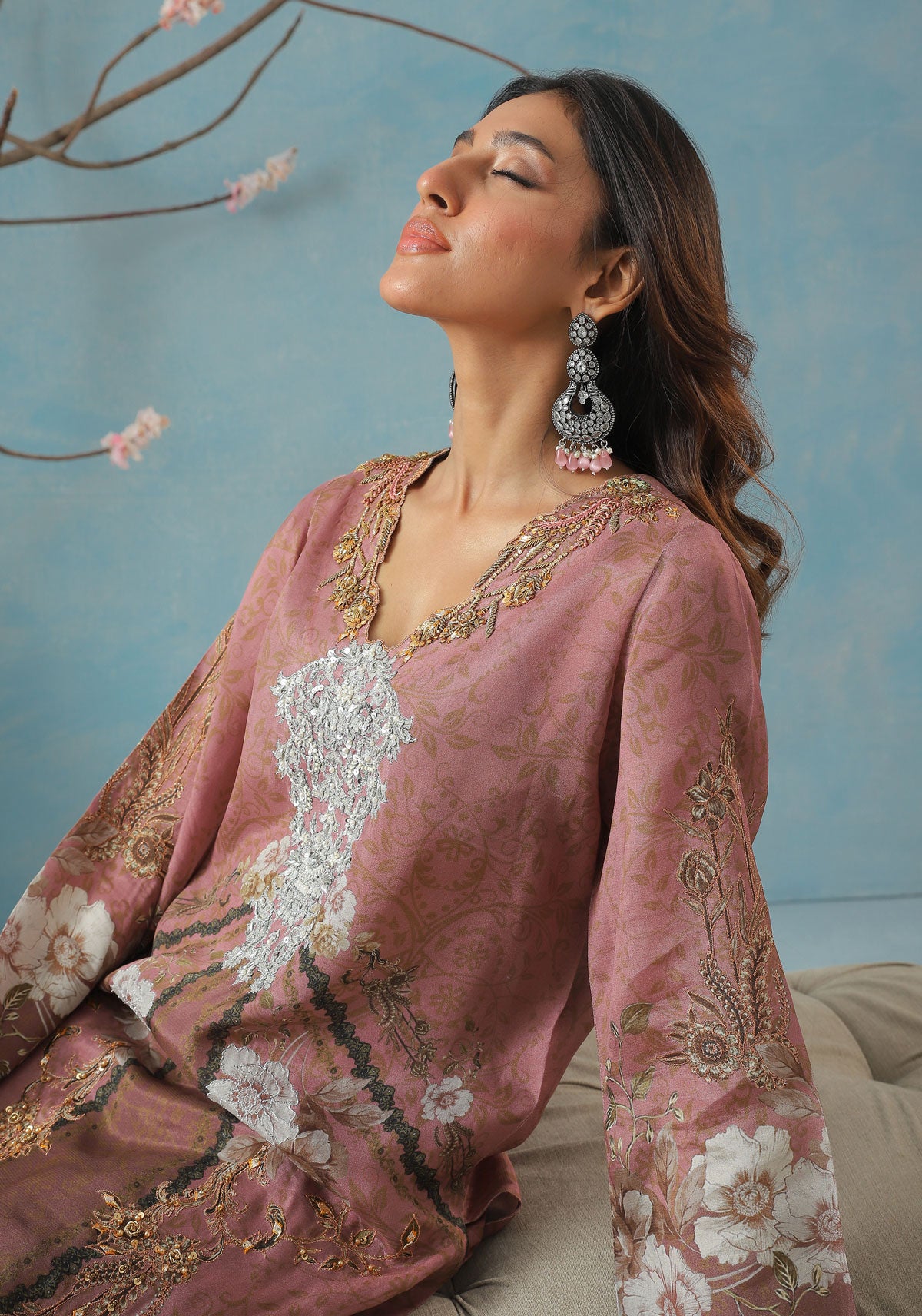 This Shamaeel's exquisite long shirt silhouette showcases luxurious baroque-inspired prints, enriched with intricate golden detailing on silk fabric. The design is further elevated with delicate gold thread outlines and gorgeous resham and zardozi hand embroidery, creating a mesmerizing interplay of texture and shimmer. Stunning embellishments inspired by traditional jewelry motifs add a regal touch to the prints, making this ensemble truly captivating. It is paired gracefully with coordinating printed pants. Matching dupatta as shown, this outfit effortlessly blends classic opulence with contemporary elegance.