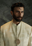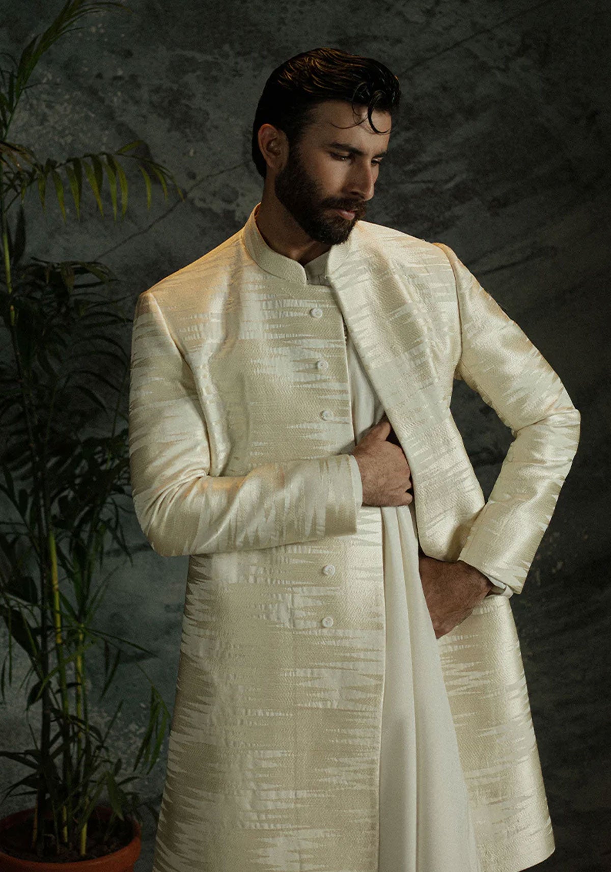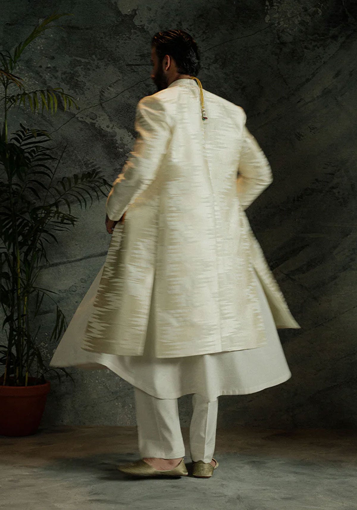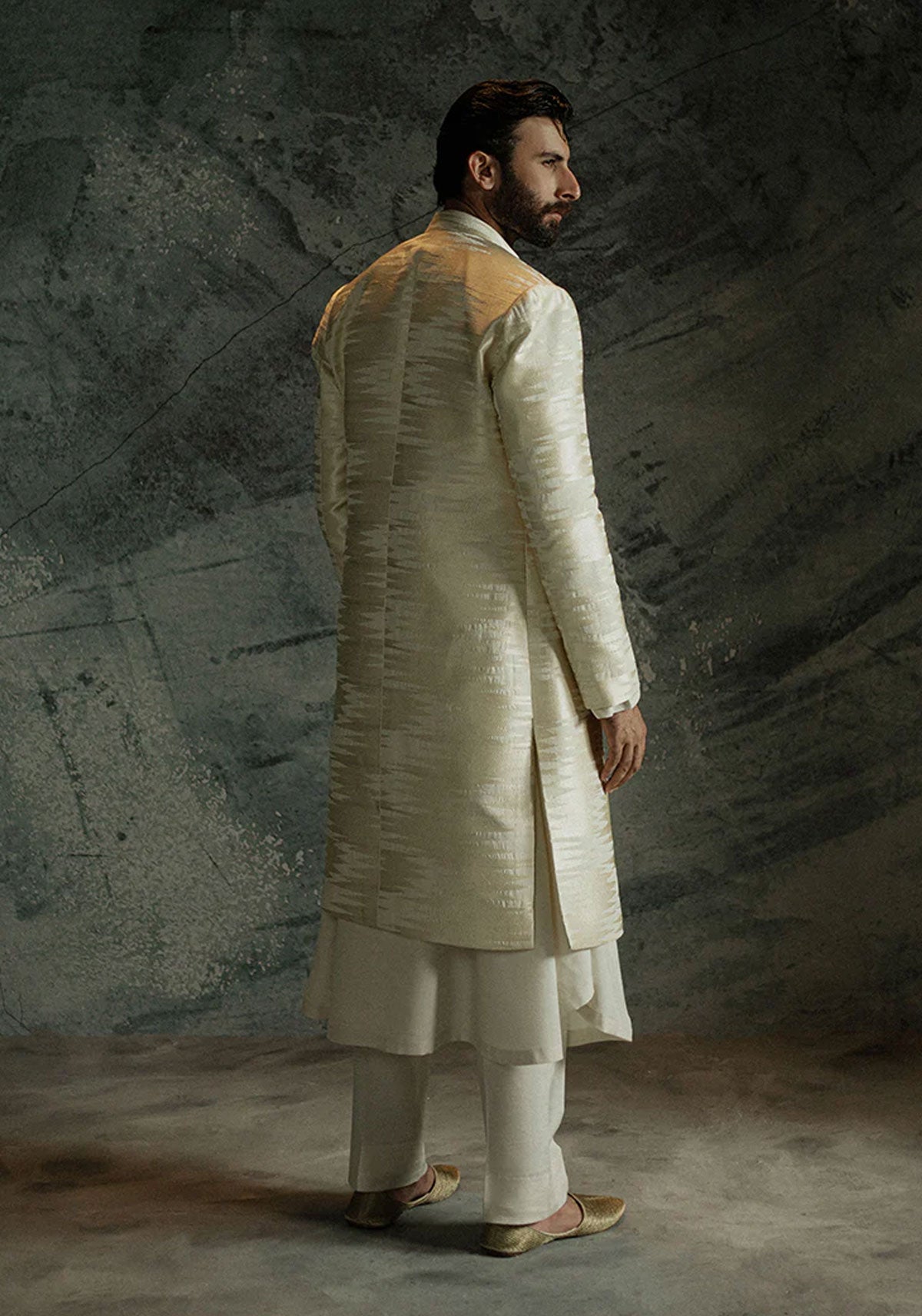 'An ivory white closed sherwani detailed with a hidden placket and sloped band, adorned with textured chevron pattern embroidery in shades of gold and ivory white.