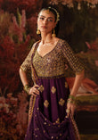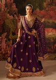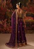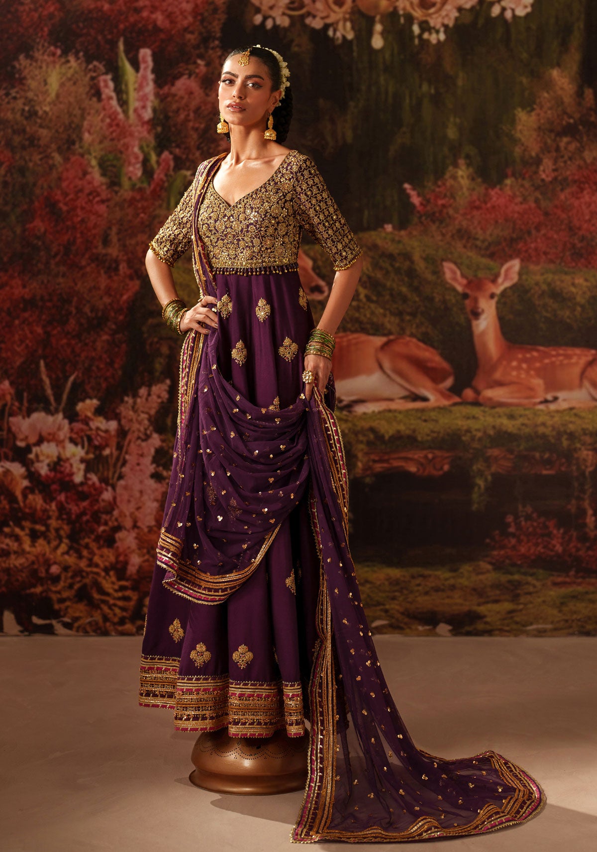 A deep purple, romantic ensemble. Bodice cut from pure exclusively silk, with an intricately hand embellished neckline. Delicate booties and sequins adorn the kaalidar along the panels with a heavy hand worked borders and motifs at the edge of the kaalidar. Detailed with heavy layered gota trimmings at the hem. Paired with a dupatta drenched in enticingly luminous Sitara chan with an elaborate gota borders on all four sides. - A striking, versatile choice for any manner of occasion.