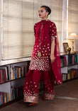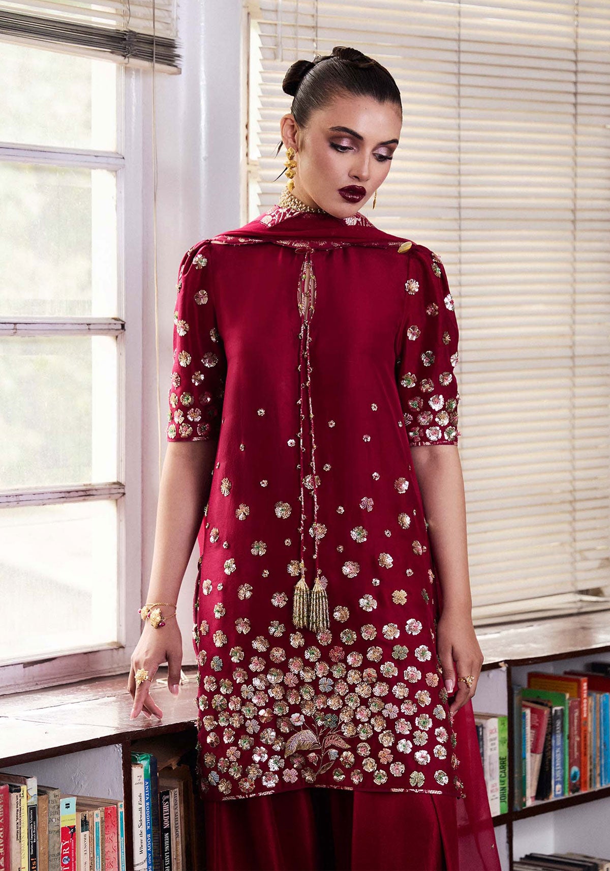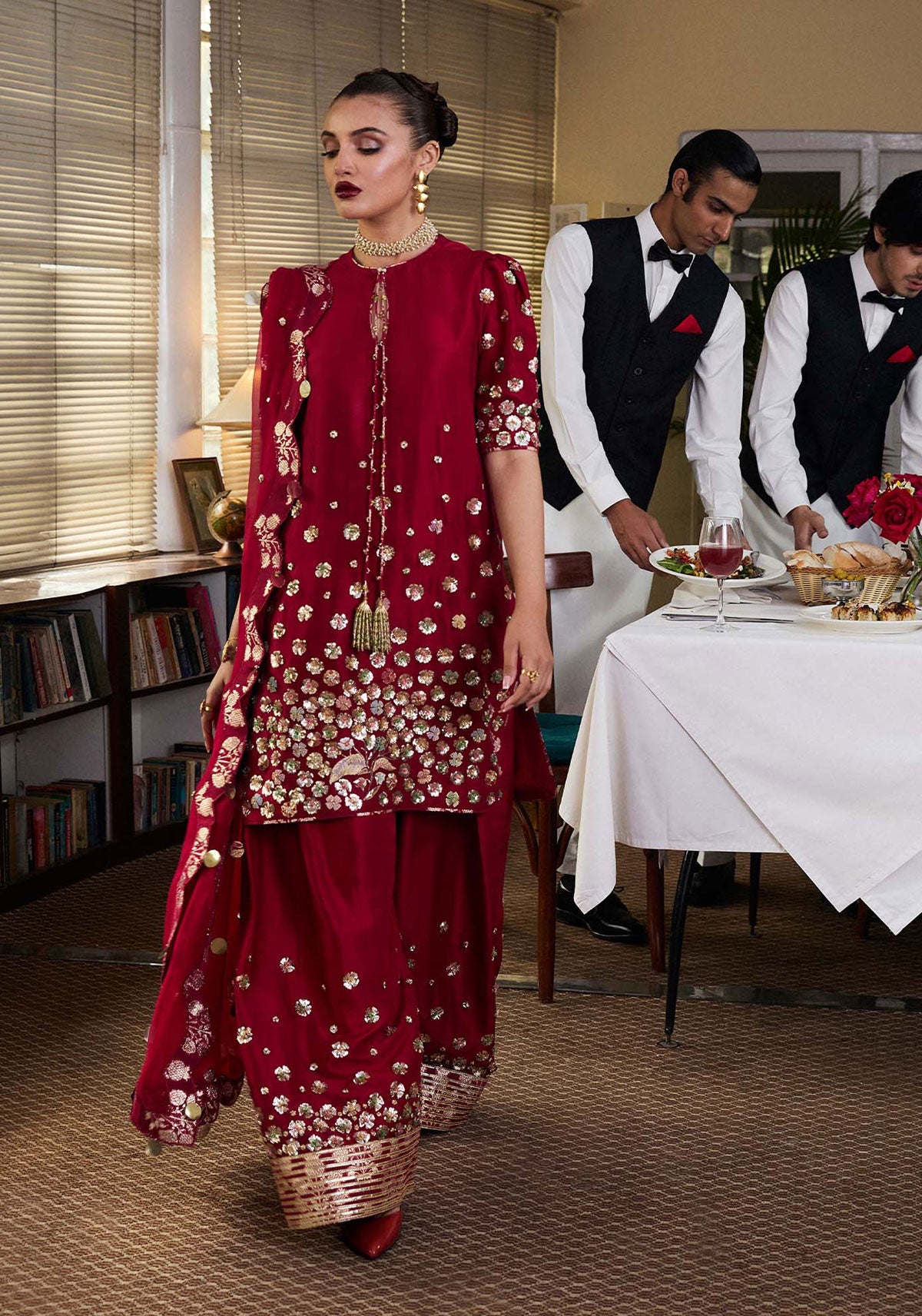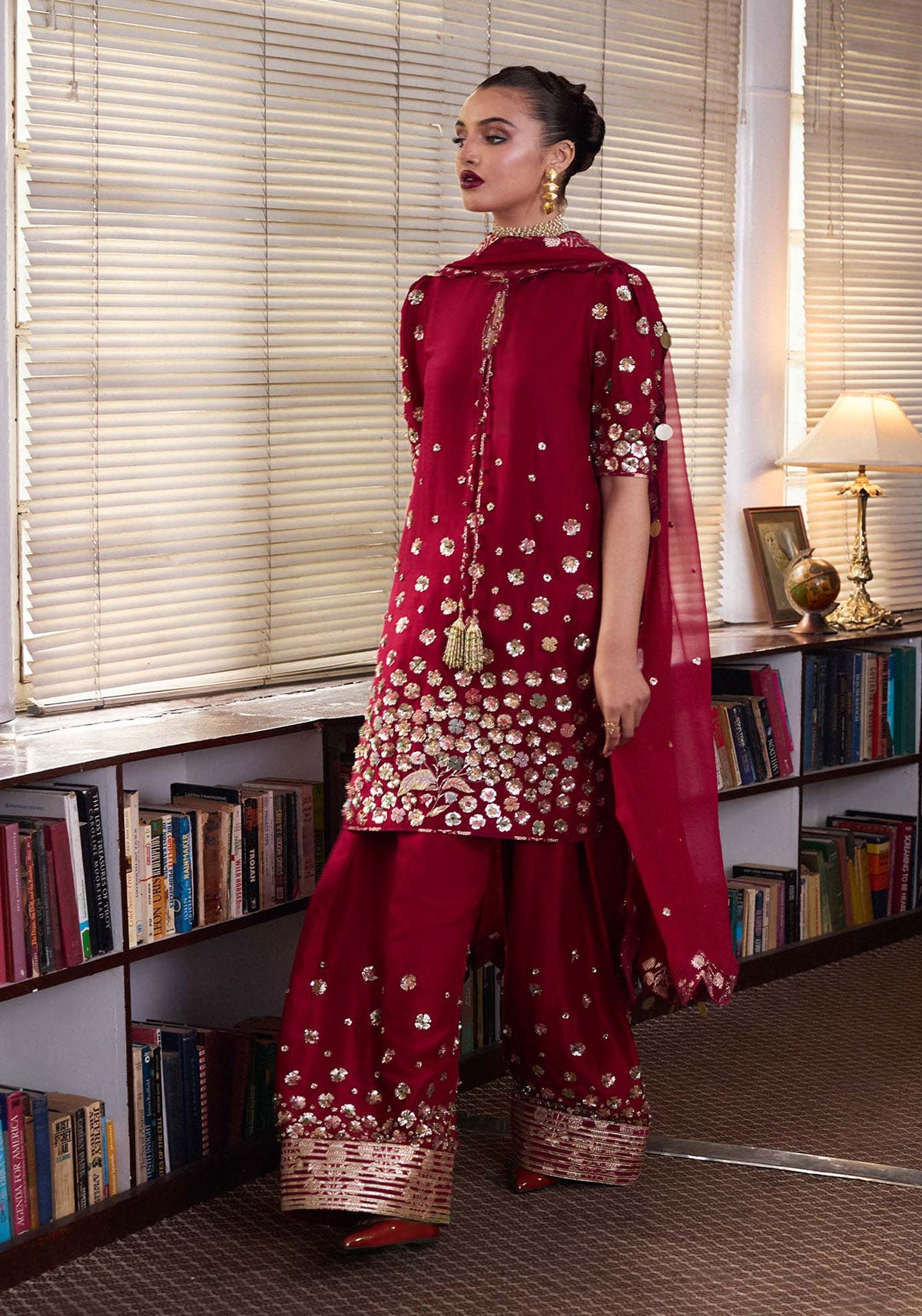 Make a statement of elegance and grace with this stunning hot pink ensemble, meticulously crafted to capture hearts. The outfit features a pure raw silk short shirt, radiating sophistication with its soft sheen and luxurious feel. Adorned with intricate golden hand embellishments of mukesh and dabka, the shirt exudes timeless beauty, elevating your presence with every movement. Paired with a perfectly tailored raw silk shalwar, chanderi silk delicate border adds a touch of finesse and refinement. The pièce de résistance is the organza dupatta, draped to perfection, spray-painted with hand-embellished flowers that flutter in a soft, floral cascade. Every detail of this ensemble is designed to turn heads, ensuring you stand out in the most enchanting way. Ideal for a special occasion or evening affair, this outfit is a blend of tradition and contemporary artistry, crafted to make you feel nothing short of royal.