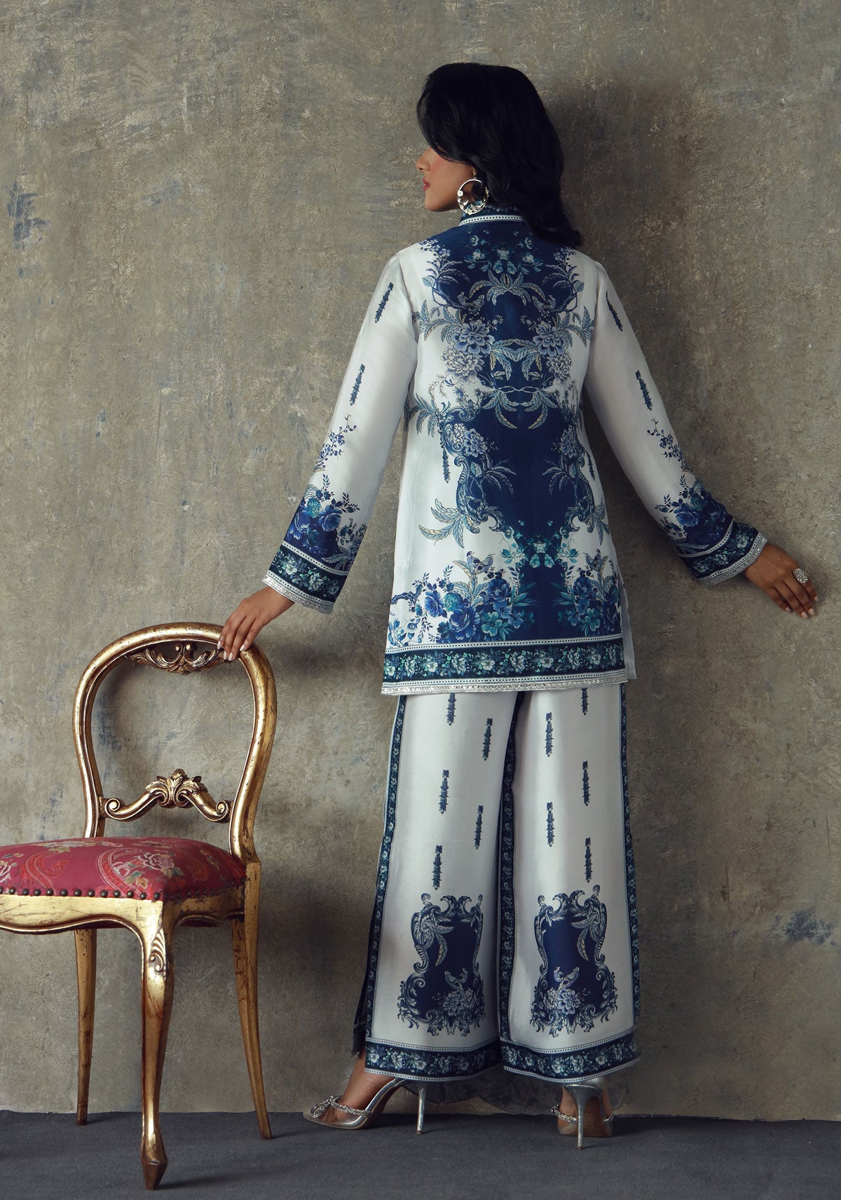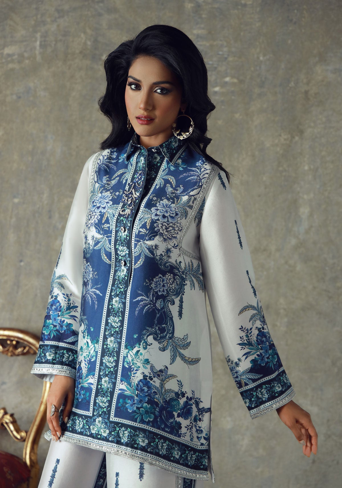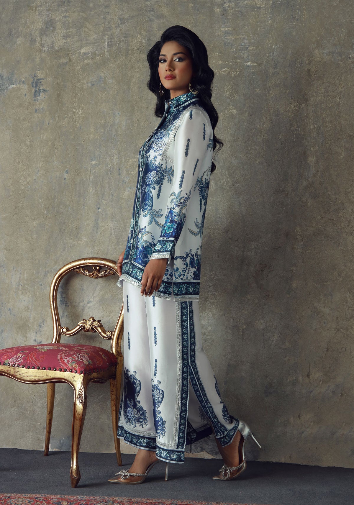 This elegant printed co-ords set by Shamaeel features a short button-down shirt and wide-leg pants, finished with detailed borders. The front placket showcases a motif with handwork, limited to the upper part. A silver embroidered border accents the armholes, sleeve hems, shirt hemline, and the front of the trousers. The design exudes classic charm with its regal patterns, making it a perfect choice for a sophisticated and graceful look at formal gatherings and festive occasions.