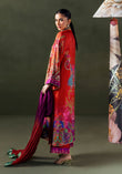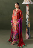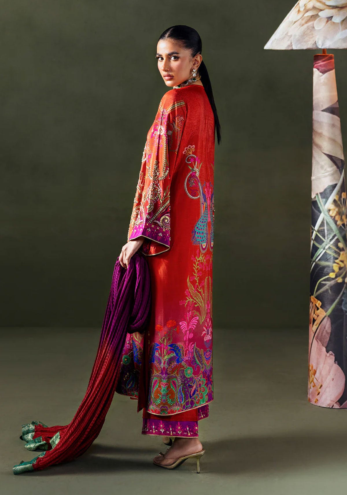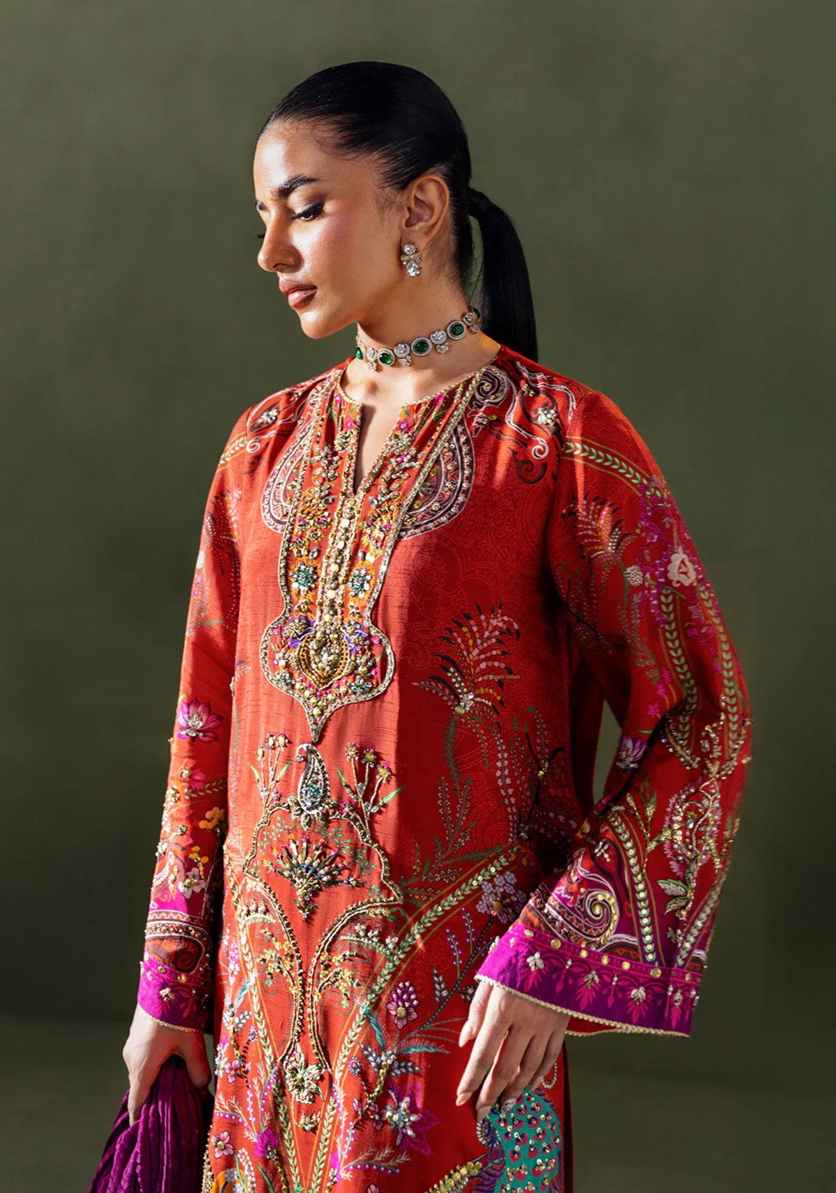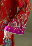 A majestic deep rust set featuring a long shirt with a graceful flared cut, richly adorned with sequins and bead work in floral, paisley, and peacock motifs. The neckline and front of the shirt are heavily embellished, while the sleeves are beautifully worked with accents of fuchsia and gold. Styled with a two-toned crushed dupatta and tailored trousers, detailed at the hem, this ensemble perfectly merges traditional artistry with modern sophistication.