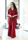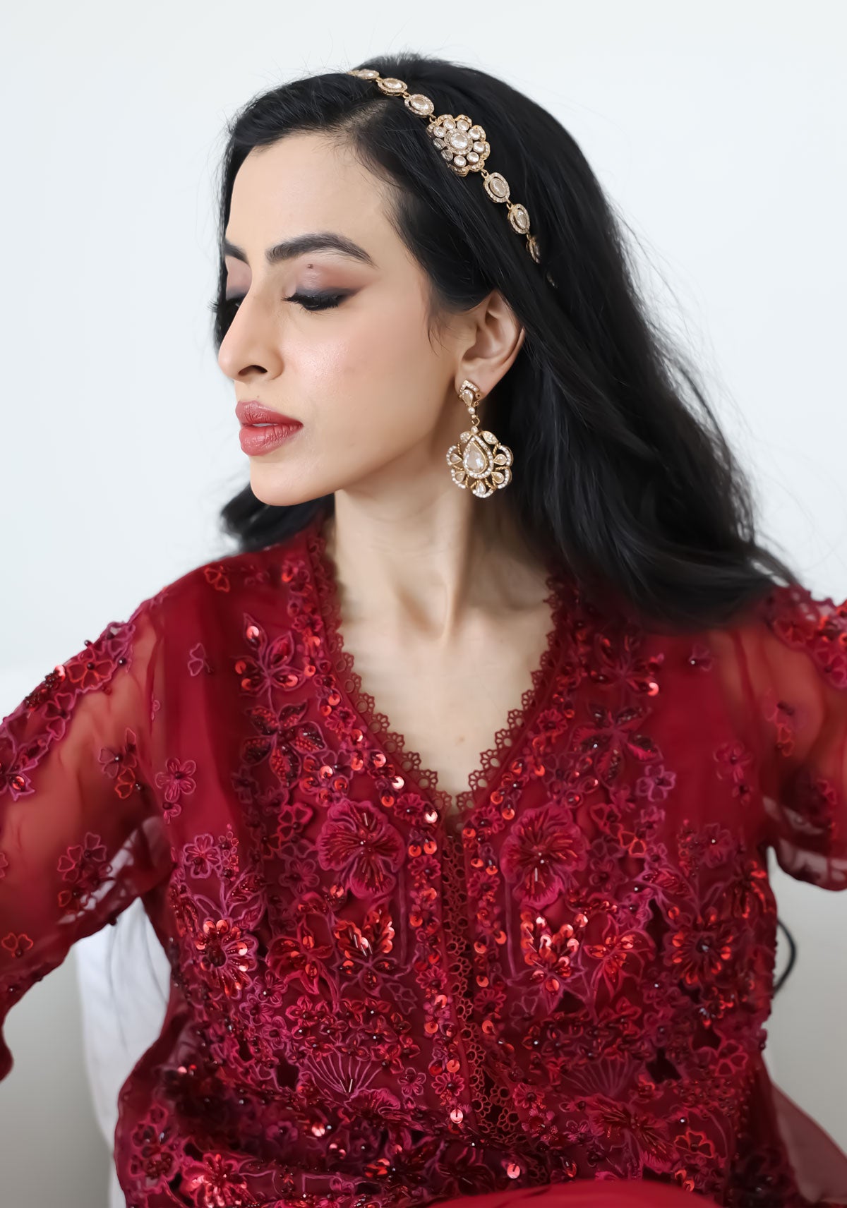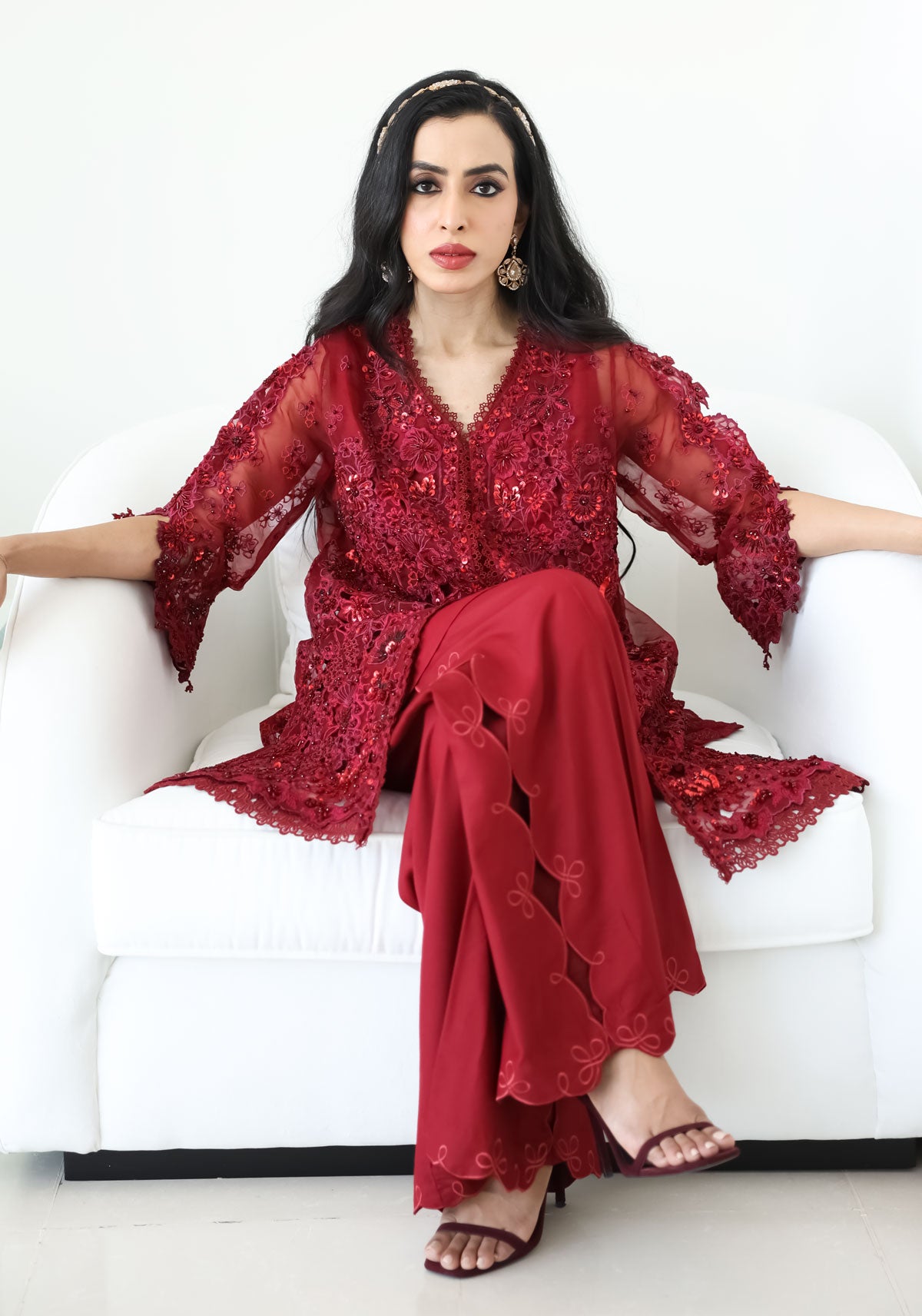 Imbued with refined elegance, this deep red on red dress harnesses grace and finesse. Crafted on organza fabric, the embroidered shirt features a timeless ditsy floral red embroidery with captivating hand work details in hues of red. A sleek organza dupatta and cutwork stitching detail on culottes add the perfect finishing touch to the dress, making this set a versatile addition to your festive wardrobe.