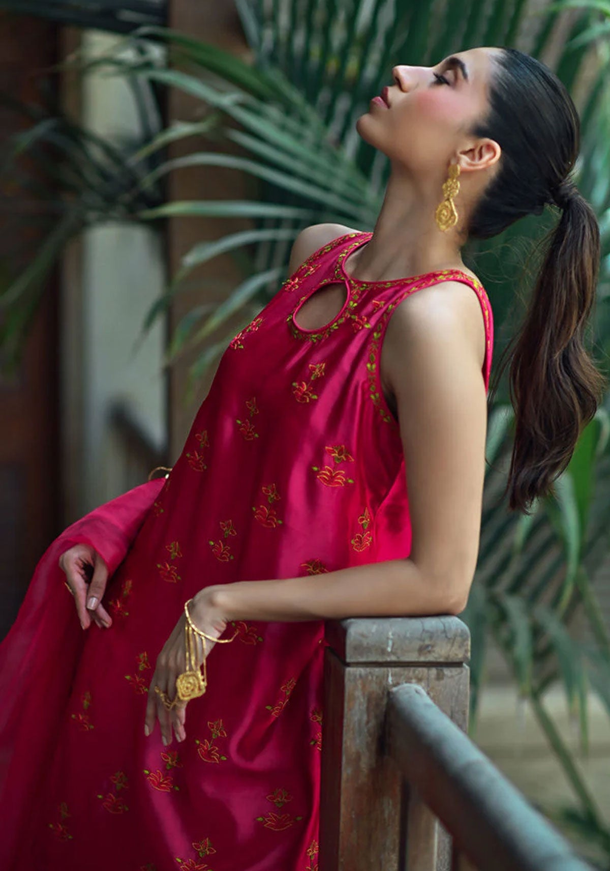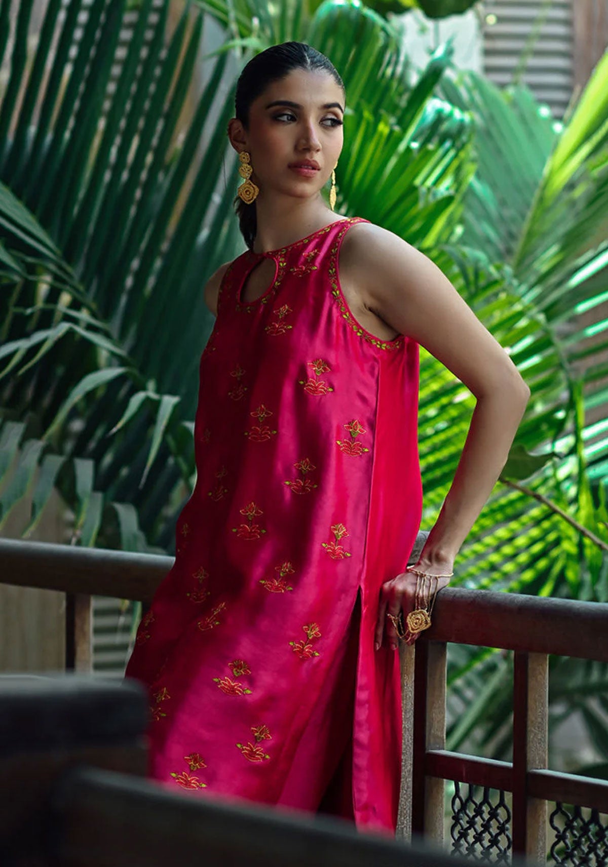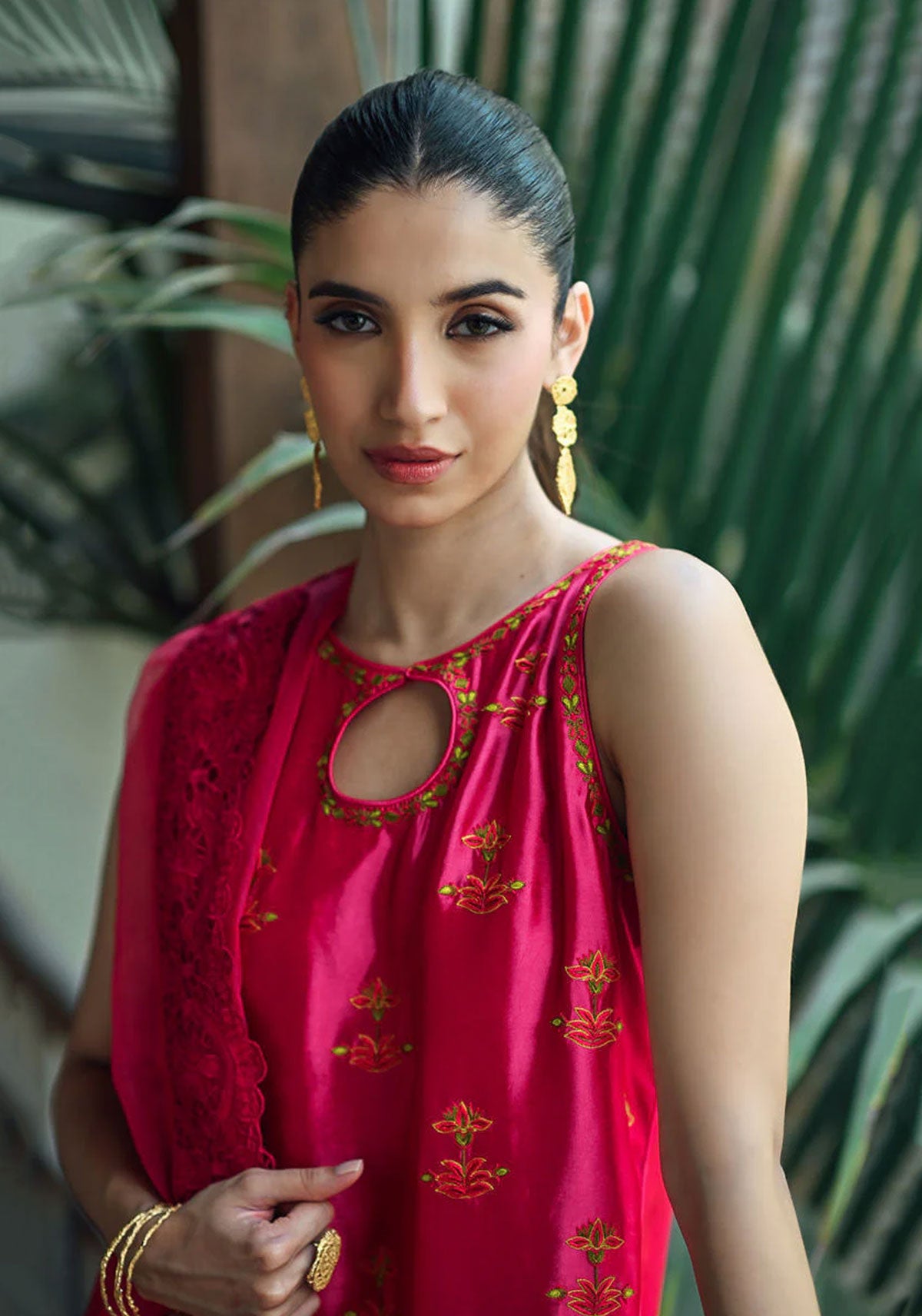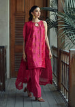 Elevate your style with this stunning hot pink silk ensemble. Intricately adorned with resham embroidery all over, it radiates vibrance and allure. Paired with a complementary organza dupatta and exaggerated silk shalwar featuring embroidery on the pancha, this outfit exudes elegance and sophistication, perfect for any special occasion.