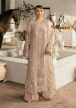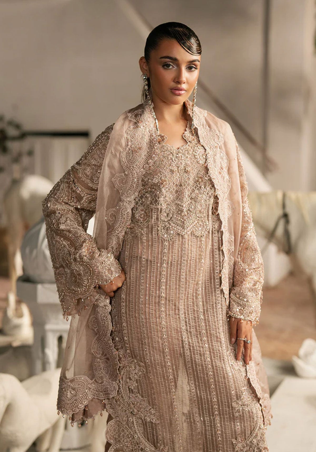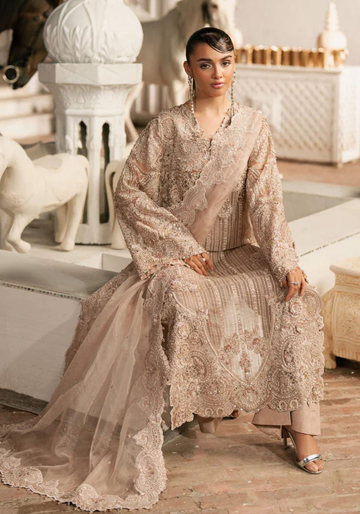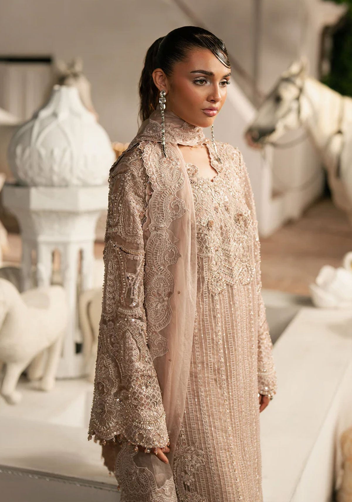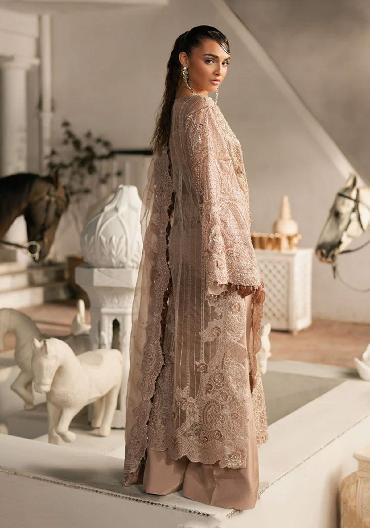 Rosara is a portrait of feminine grace, woven in soft peach pink and adorned with timeless artistry. The long organza shirt shimmers under the touch of Swarovski crystals, dabka, zari, cutdana, sequins, and delicate beadwork, each detail placed with care, transforming the silhouette into a radiant masterpiece. Its V-neckline, richly embellished, frames the look with poise and grandeur.