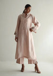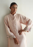 The Rose Mist set consists of a long shirt and subtly embroidered pants, crafted from pure cotton silk in a soft tea pink shade, features scalloped sleeves beautifully enhanced with multi-colour embroidery. Designed with slightly dropped corners, this elegant piece is completed with handmade double-sided buttons and delicate fringe accents on the hemline, showcasing refined craftsmanship and style.