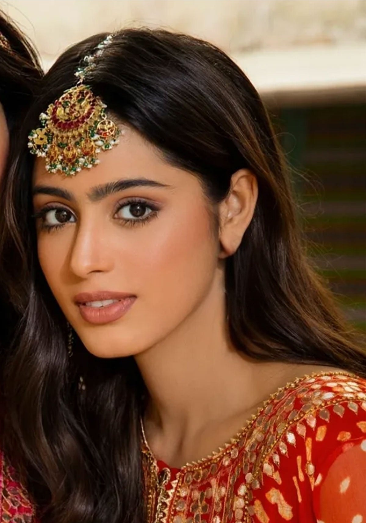 A breathtaking crescent-shaped (Moon) tika, exuding royal elegance and intricate craftsmanship. This headpiece features a radiant centerpiece adorned with traditional red, green, and white stones, set in a detailed gold-toned filigree frame. Floral motifs cascade from the center, accented with dangling pearl-like beads and delicate enamel work. The top section is embellished with a cluster of floral and beaded elements, completing the traditional bridal look. Perfect for weddings, festive occasions, and cultural ceremonies, this piece adds timeless charm and regality to any ensemble.