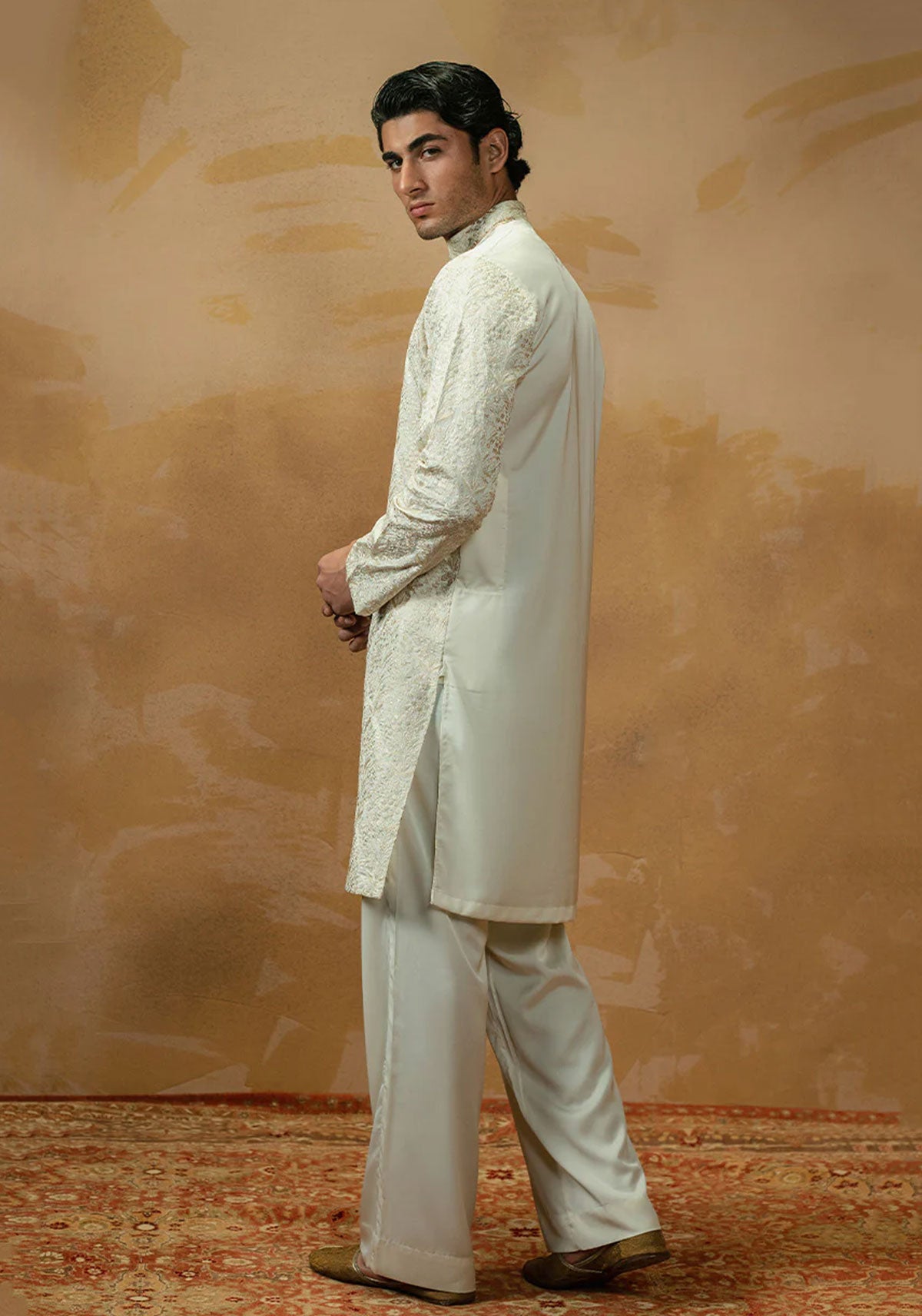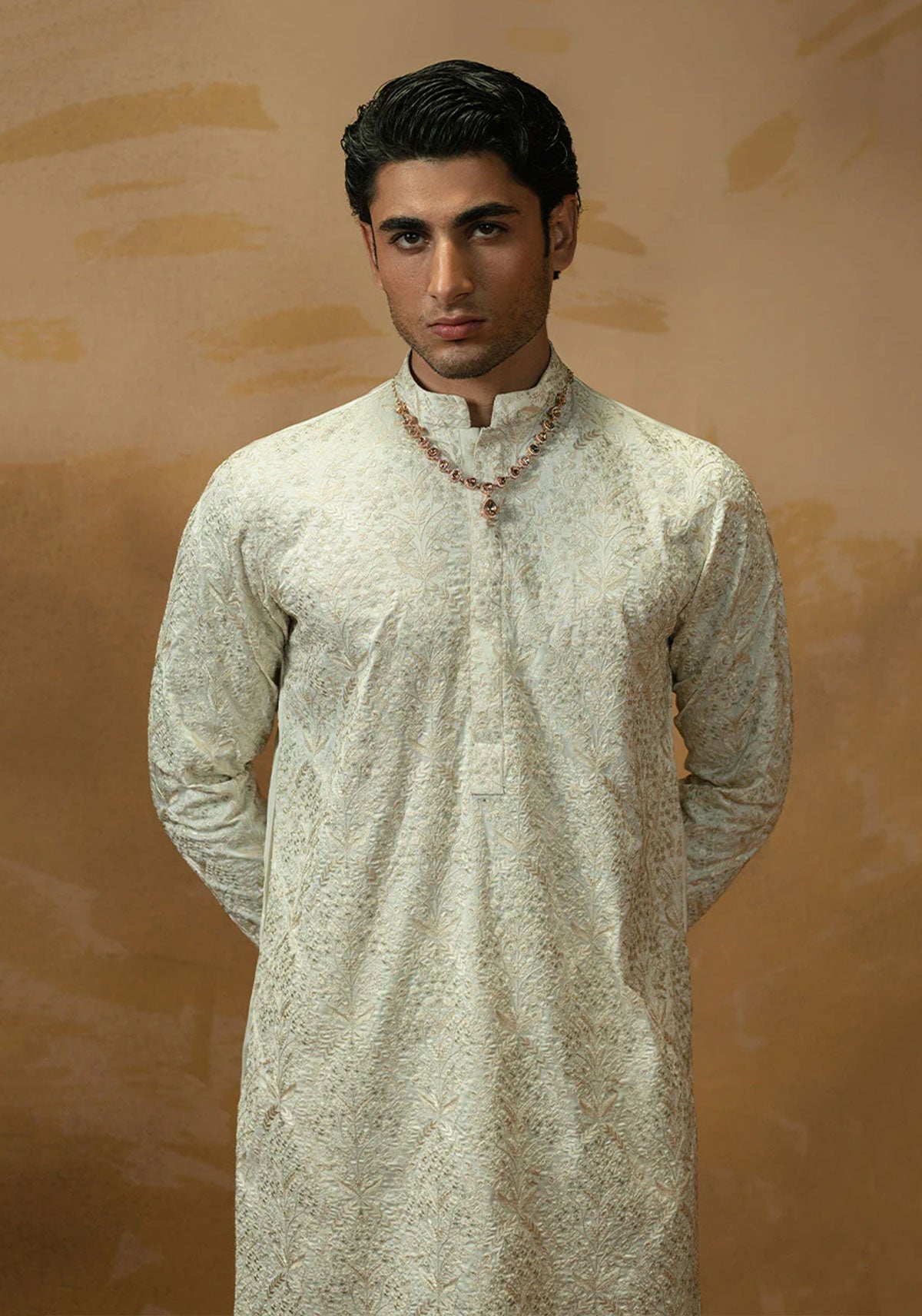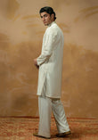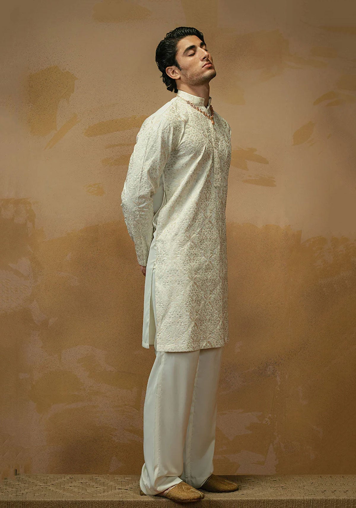 A cream white kurta pajama set with bold all over traditional patterns with sequins and in depth renderings.
