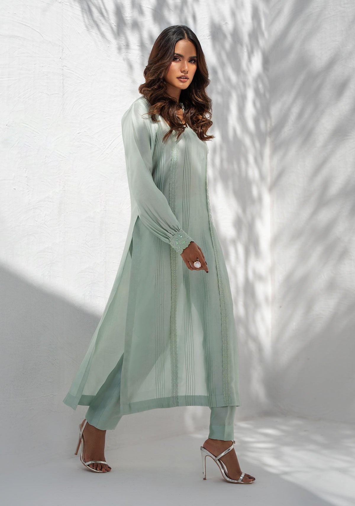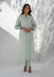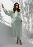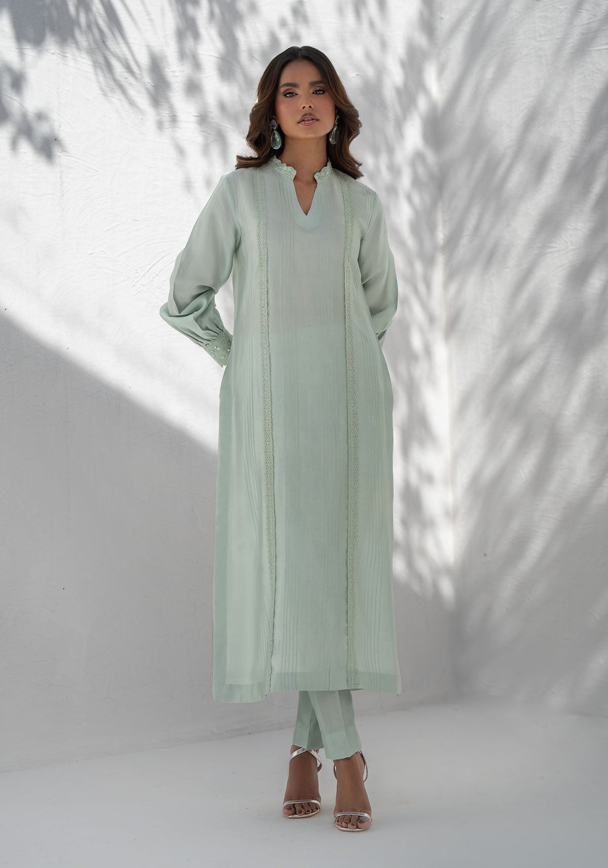 This ensemble features a long shirt, adorned with delicate lace, hand-worked buttons on puff sleeves and pintex details. Paired with a straight pant for a perfectly minimal yet sophisticated look. Shirt length is 48 inches.