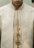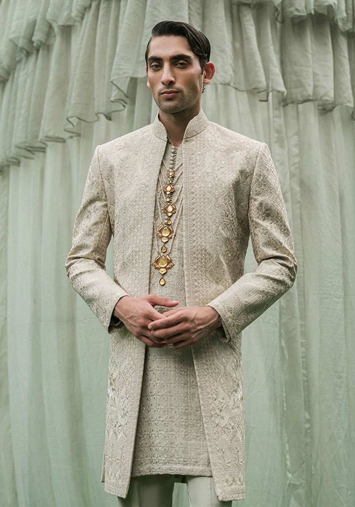 'A gold jamawar open sherwani with motifs inspired by art deco and a fusion of a geometric jaal and traditional floral patterns, further detailed with minimal tilla and sequins.