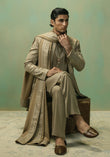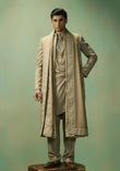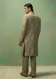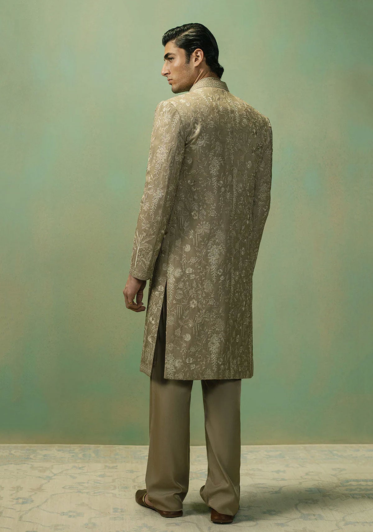 A light brown open sherwani detailed with all over floral patterns with a composed band and jungle inspired patterns on the hem, adorned with dull gold tilla.
