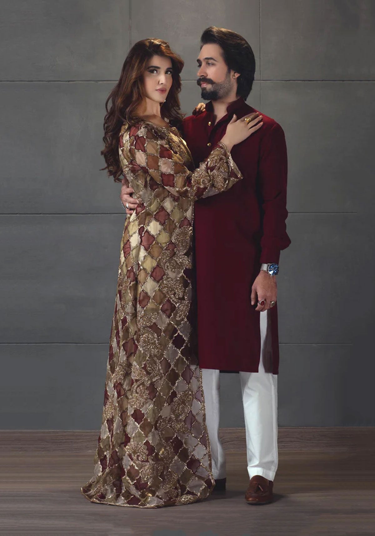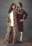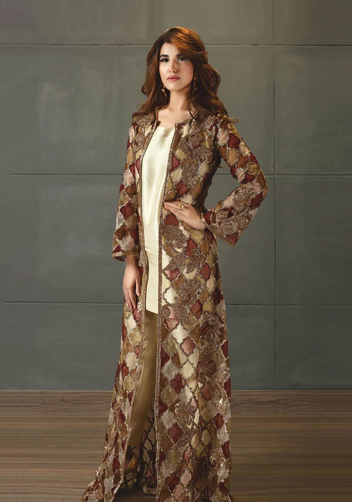 Labor of love! dedicated to traditional craftsmanship and inspired by fabrication, this jacket is constructed entirely by detracting each piece of fabric by hand to unearth the desired hue. The result is that of geometrically patterned stained glass in fall shades of bordeaux, woodbine green and clay outlined in 'naqshi' and bugle beads. It is juxtaposed against blooms of densely hand embroidered bugle beads and a minimalist metallic floor length gown for maximum impact.