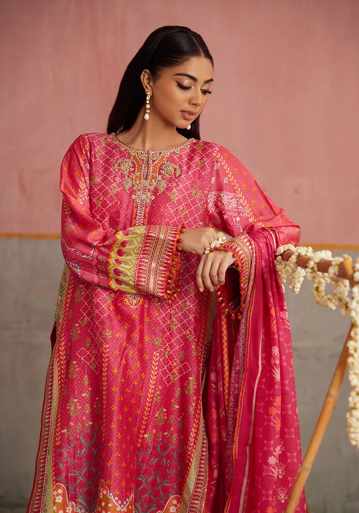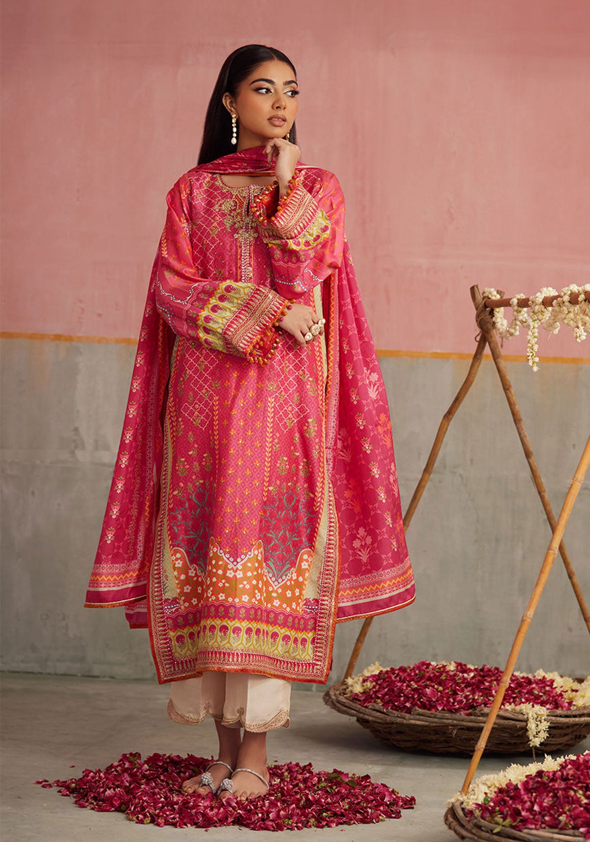 Radiant and brimming with unmissable elements, this hot pink digitally printed kurta brings a festive charm to any occasion. The neckline sparkles with a medley of intricate hand embellishments, while playful details finish the sleeves with incomparable finesse. A flowing, pure medium silk dupatta, adorned with an eye catching digital print completes the ensemble.