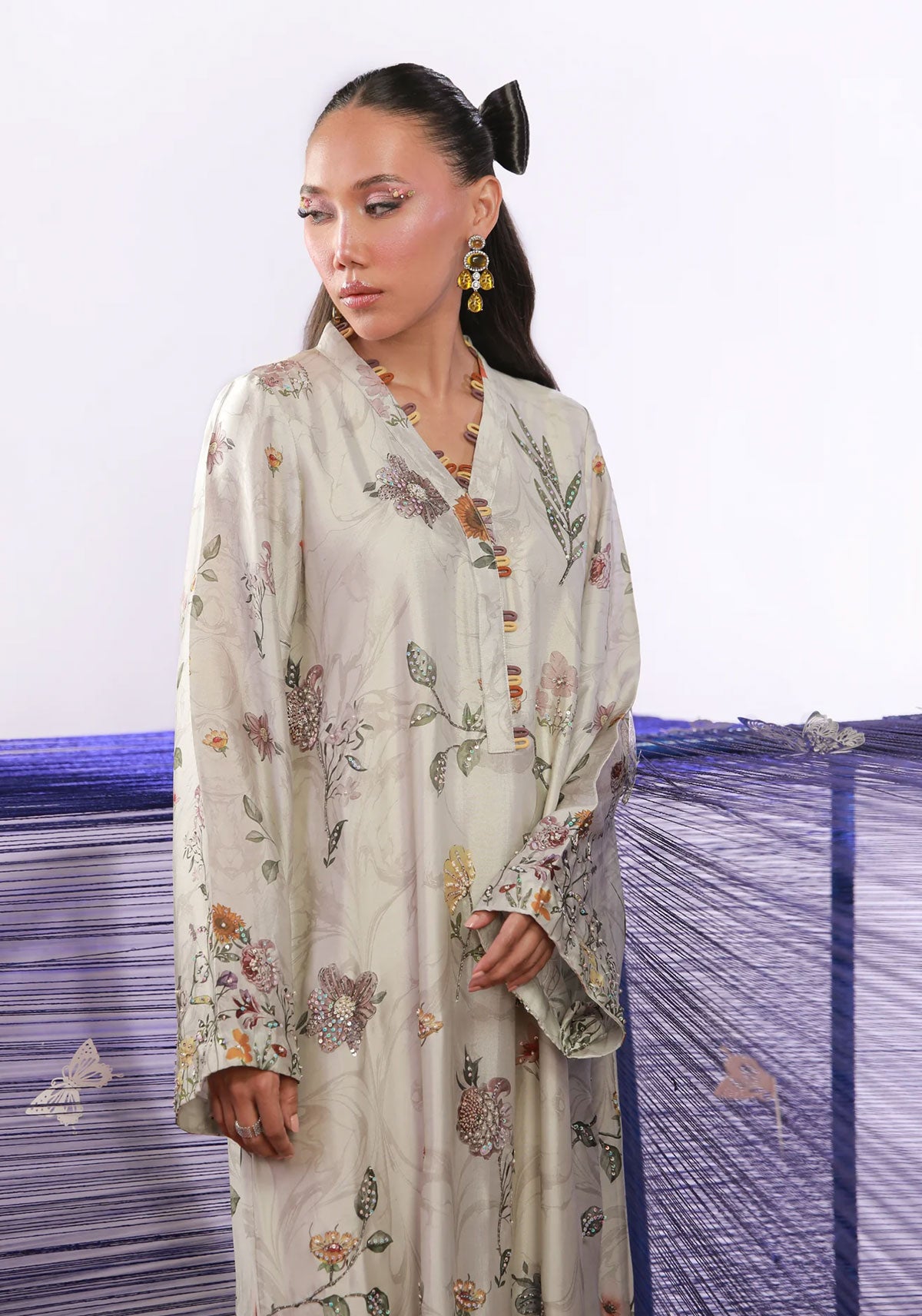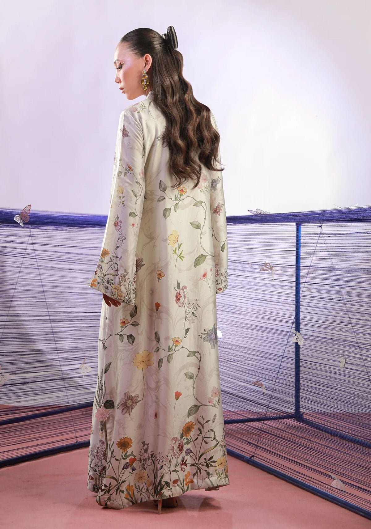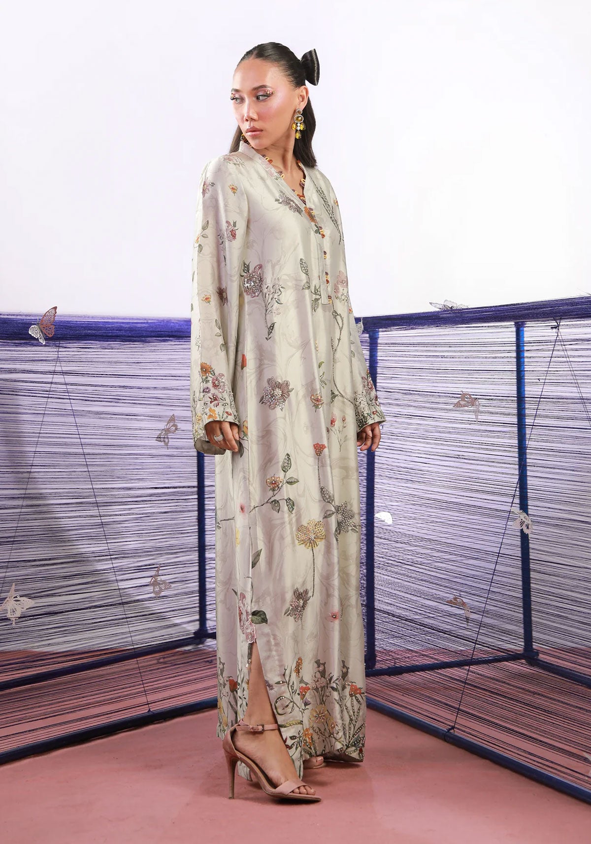 A flowing kaftan in pure butter silk, adorned with delicate floral prints that capture the beauty of nature. Subtle hand embellishments elevate the design, adding a touch of artistry and depth. Effortless in silhouette yet refined in detail, this piece embodies understated luxury and modern elegance.
