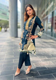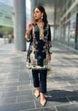 The Noir Opulence embodies timeless sophistication with a touch of regal grandeur. Crafted from deep midnight black silk, the outfit features exquisite gold embroidery cascading along the neckline, sleeves, and hem — a perfect balance of tradition and modern edge.