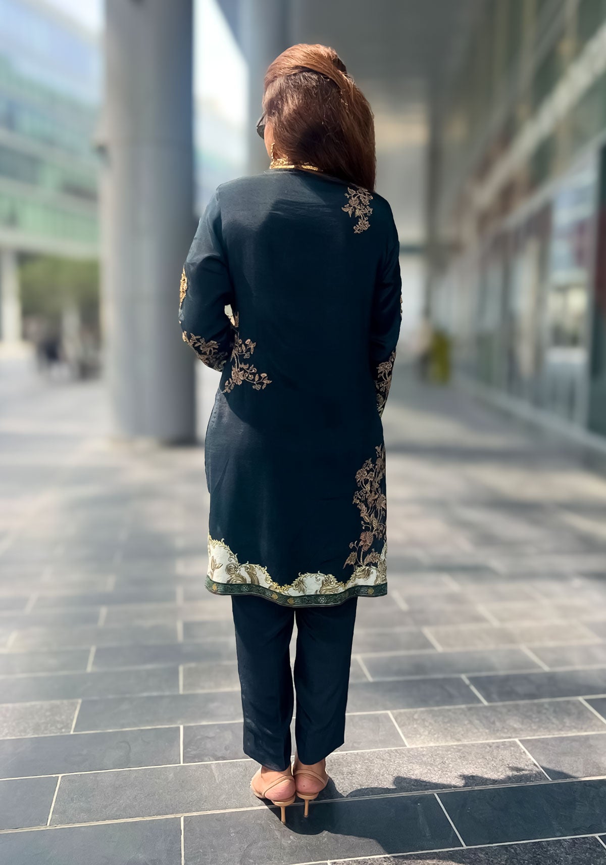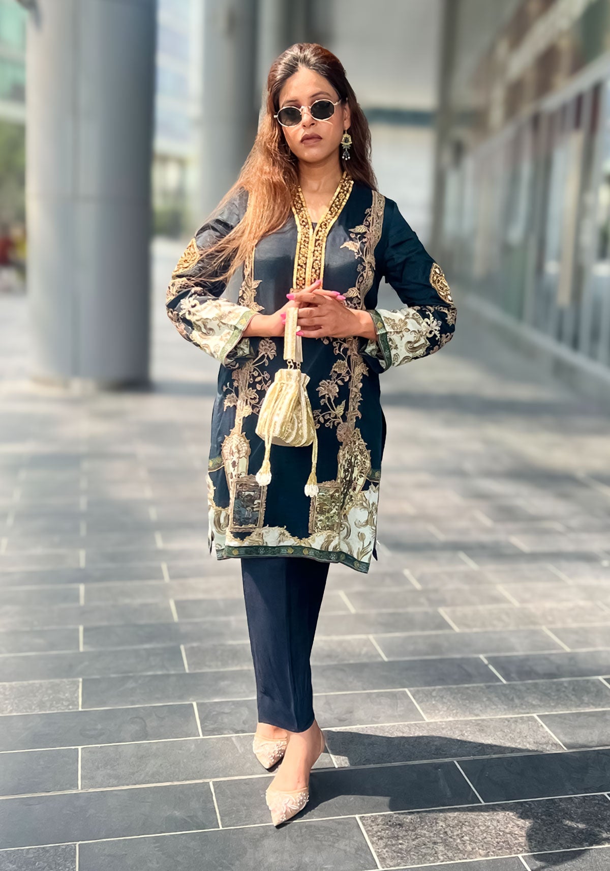 The straight-cut silhouette is paired with tailored trousers, creating a refined yet powerful look that transitions seamlessly from festive gatherings to elegant evening affairs. Each stitch celebrates artistry, luxury, and effortless poise.