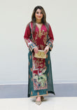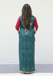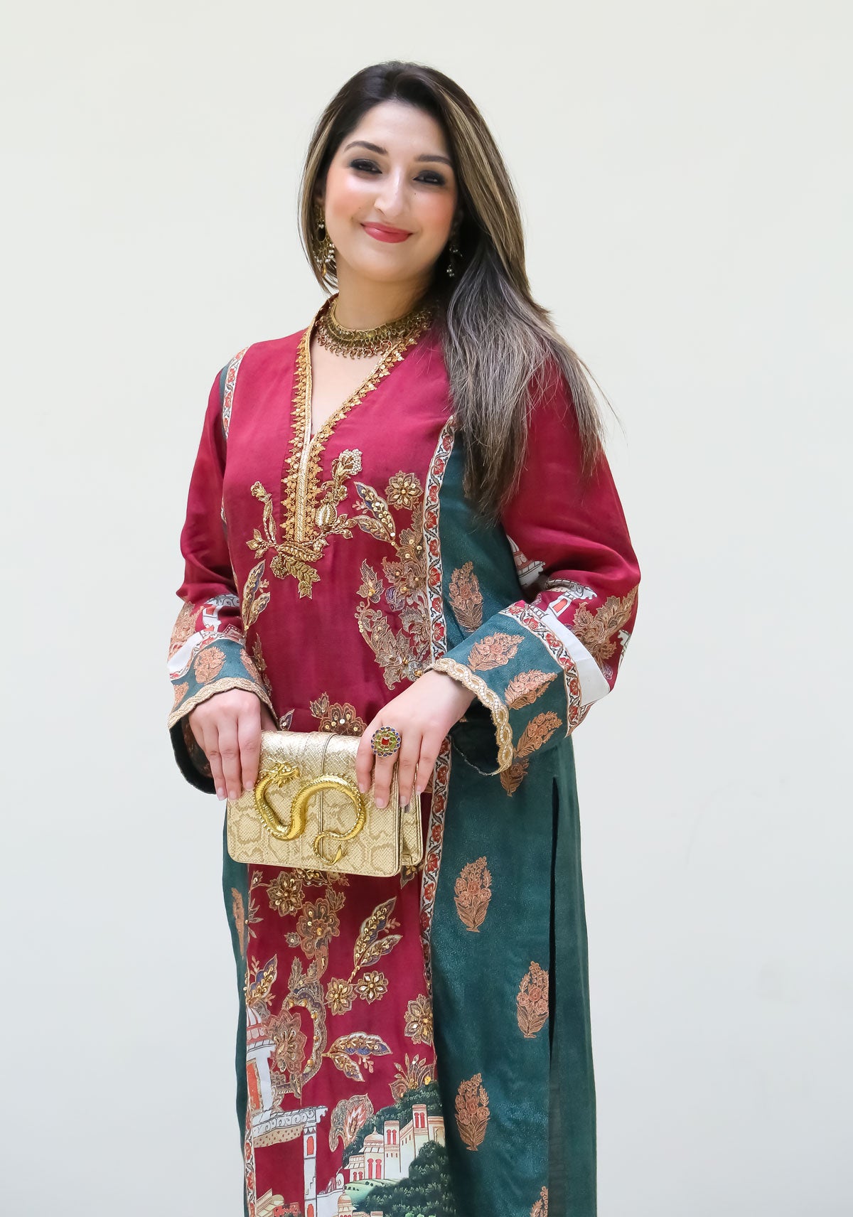 A statement ensemble exuding regal charm, this maroon and emerald long dress features intricate resham and zari embroidery with architectural and floral motifs. The deep maroon bodice is adorned with gold thread work, while the contrasting emerald green panels and sleeves add depth and elegance. Detailed borders and printed scenic patterns enhance its traditional appeal.