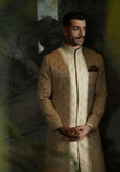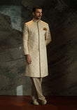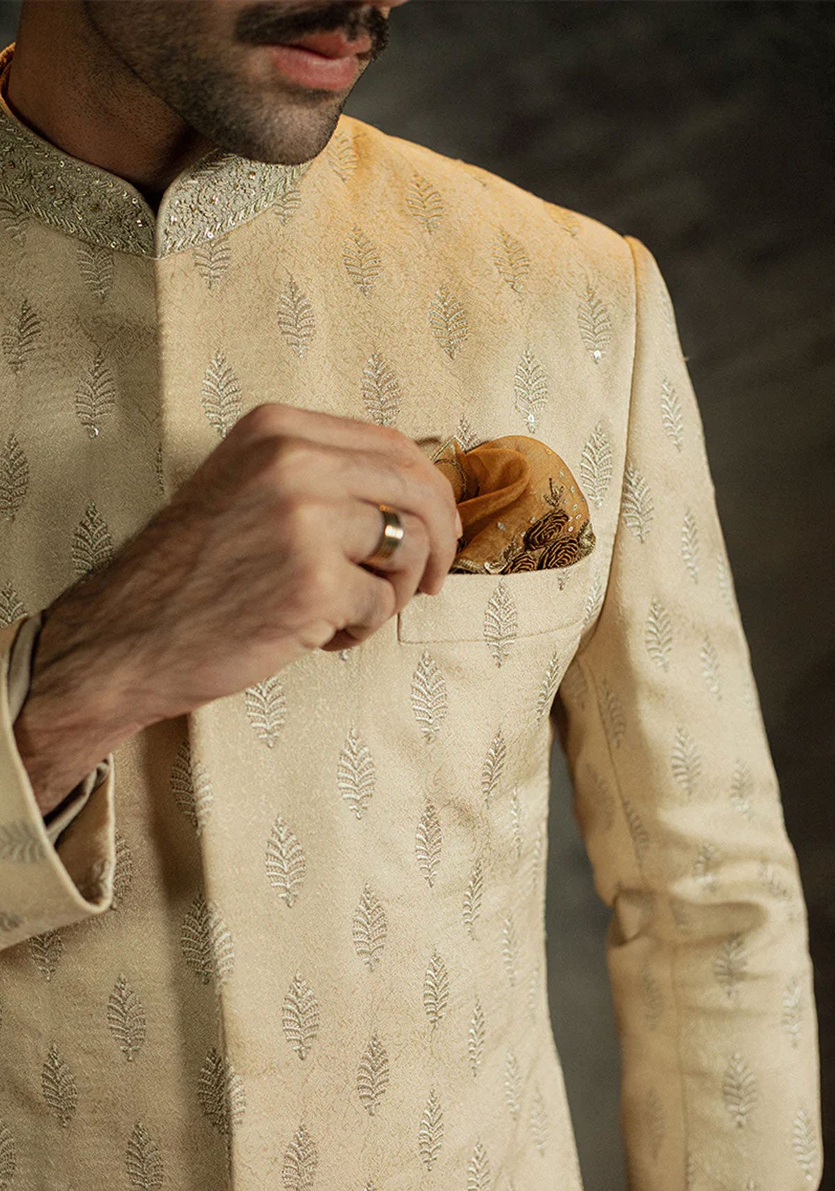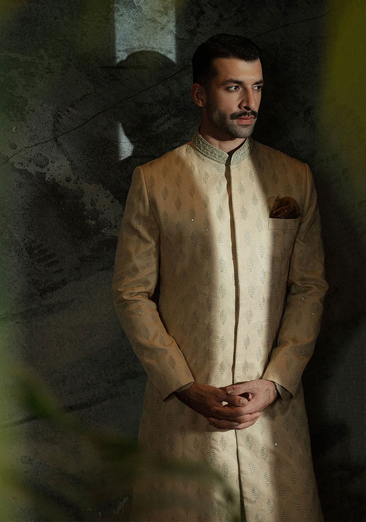 'A light beige sherwani detailed with contemporary leaf motifs adorned with sequins and hand embellished band collar.
