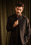 A black cotton silk kurta and pajama set with floral patterns merged with an inner border details, further accentuated with all over sequin details.