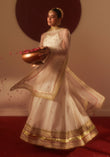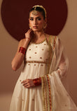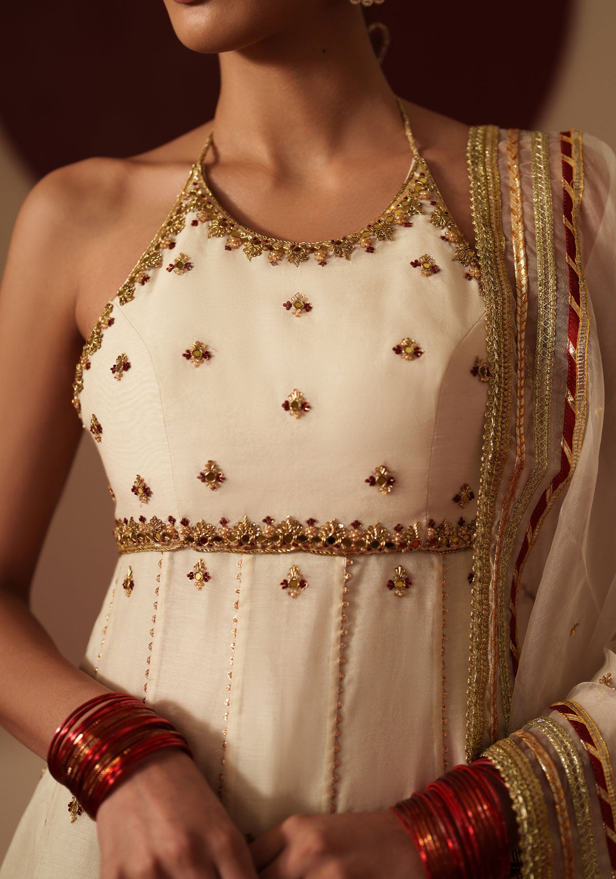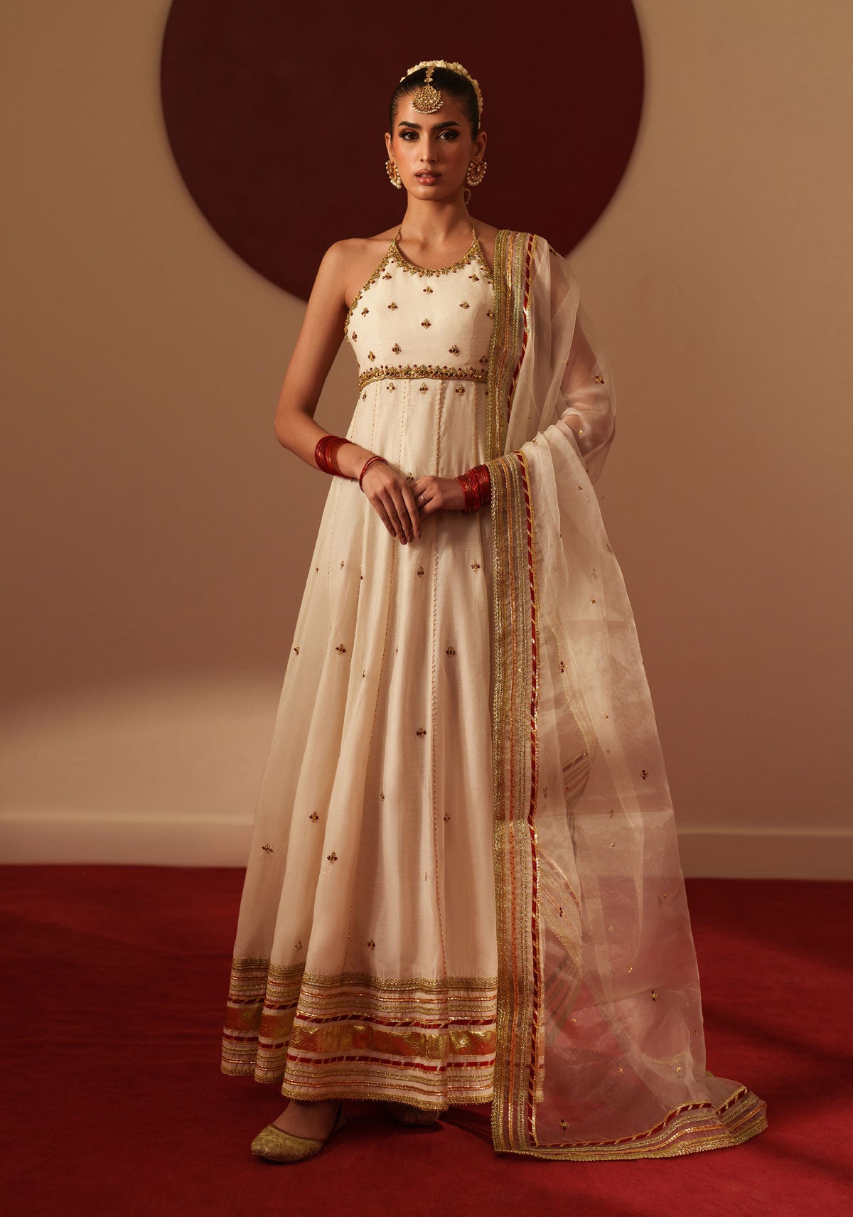 Introducing our exquisite ensemble, featuring a pure khaddi silk kaalidar with intricate mirror work detailing's with gota dabka, nakshi, and Gota trimmings on the panels with a volume skirt insert to give it that extra wow factor, the kaalidar is adorned with gold nakshi, gota, sequins, dabka, and tiki stones, and mirrors creating a mesmerizing and luxurious design that catches the light and adds a touch of sparkle. This outfit has a statement low-cut back with hand-worked tassel detailing's. Paired with an organza dupatta with mirror work detailing. Wear this ensemble to a wedding, special occasion, or any event where you want to make a statement. The intricate embellishments and delicate fabrics make this ensemble a true work of art.