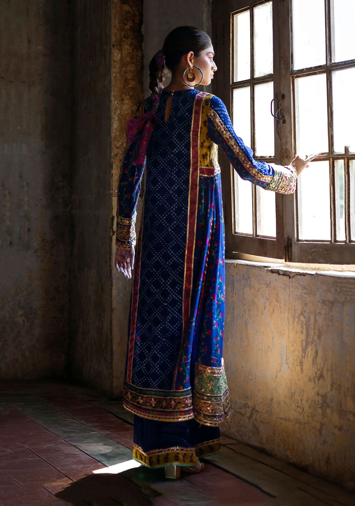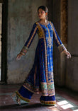 A stunning fusion of elegance and artistry, this blue long kameez in pure grip features sleek slits running down the panels, paired with flowing wide-legged silk pants. The kameez is a masterpiece of design, blending geometric and floral patterned patches, adorned with exquisite zardozi, vibrant resham embroidery, and gleaming gota work, all framed by contrasting borders. Finished with Indian maghzis and golden gota kingrees, the ensemble embodies refined heritage. The pants echo the intricate detailing, with block-printed pattis, golden gota kingrees, and colorful maghzis at the hem.