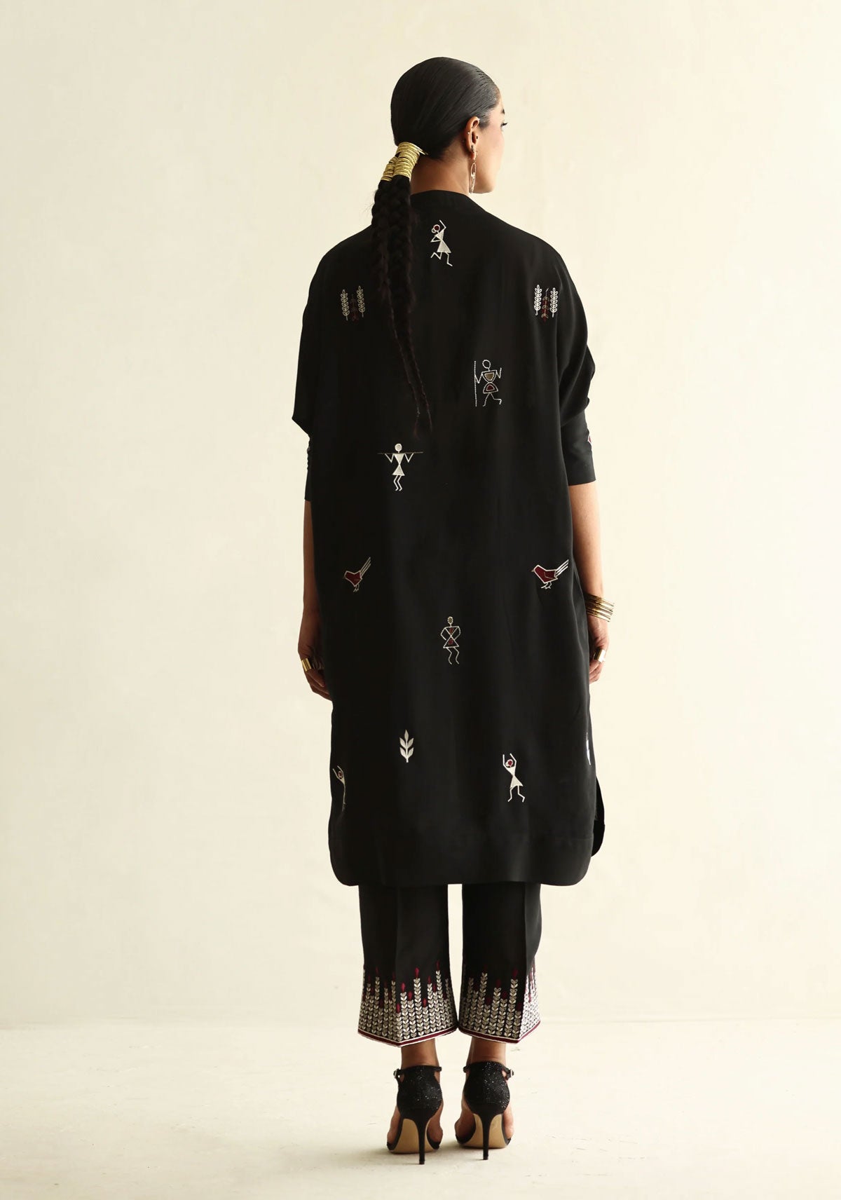 Adorned with human silhouettes and tribal embroidery details, accented by delicate mirror work, this piece exudes elegance. Its sophisticated design and flattering cut are tailored to enhance every body shape beautifully.