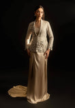 An enchanting display of craftsmanship, this silver bugle beaded coat shimmers with intricate beadwork and features delicate 3D flowers blooming along the hem of the coat and sleeves. Paired with a flared charmeuse skirt and a slip inside the jacket. The look reflects refined glamour and graceful movement.