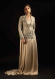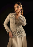 Silver Bugle Beaded Coat with 3D Flowers and Flared Charmeuse Skirt