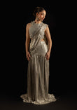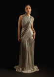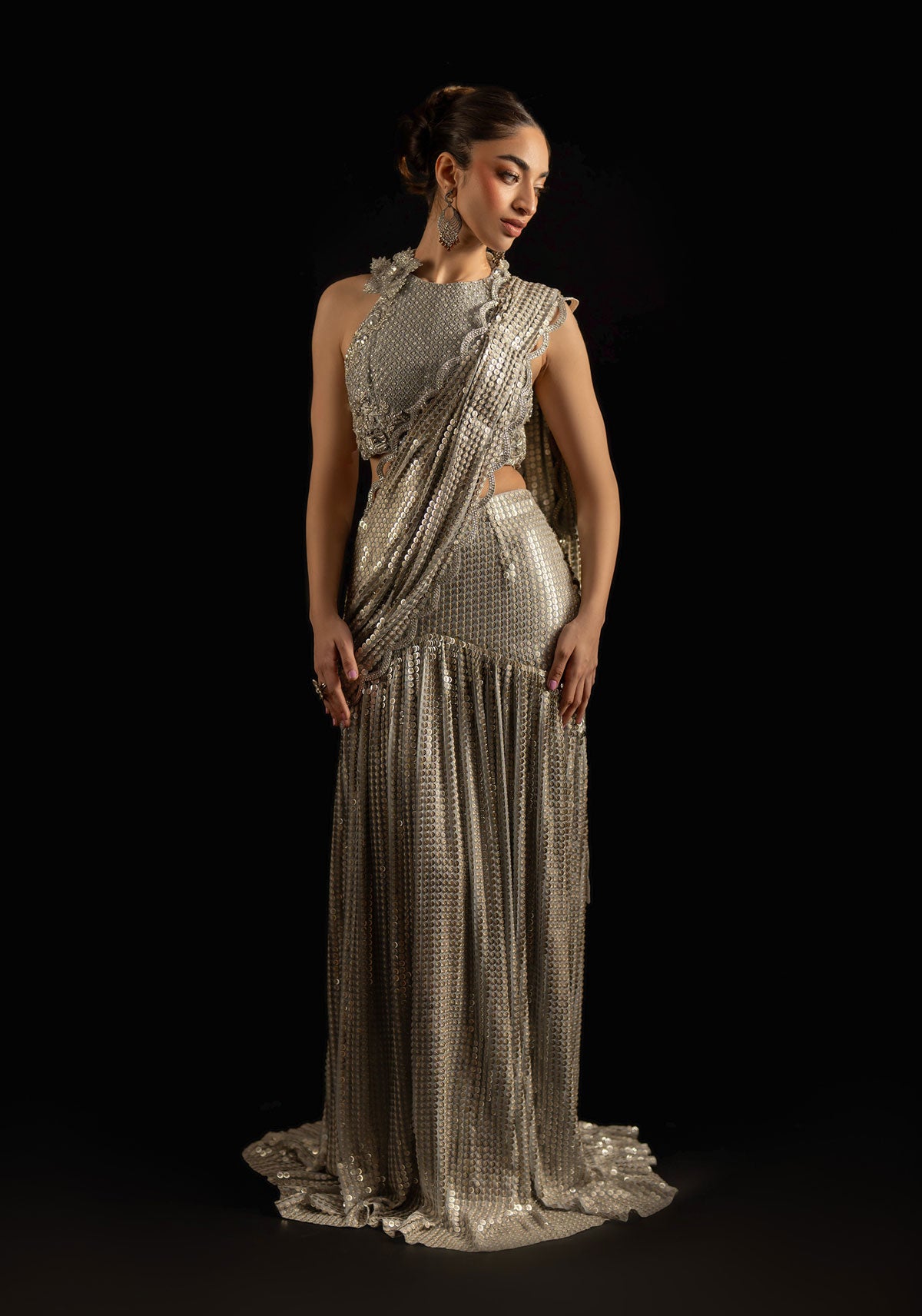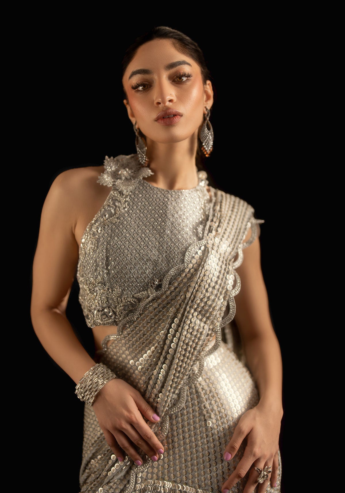 This silver embellished choli shimmers with intricate handwork and delicate 3D floral accents encrusted along the back, creating a sculpted and couture finish. Paired with a sequined embellished saree Skirt, it cascades effortlessly, while the crystal scalloped pallu adds a soft, glistening charm, making this ensemble a perfect balance of grace and glamour.