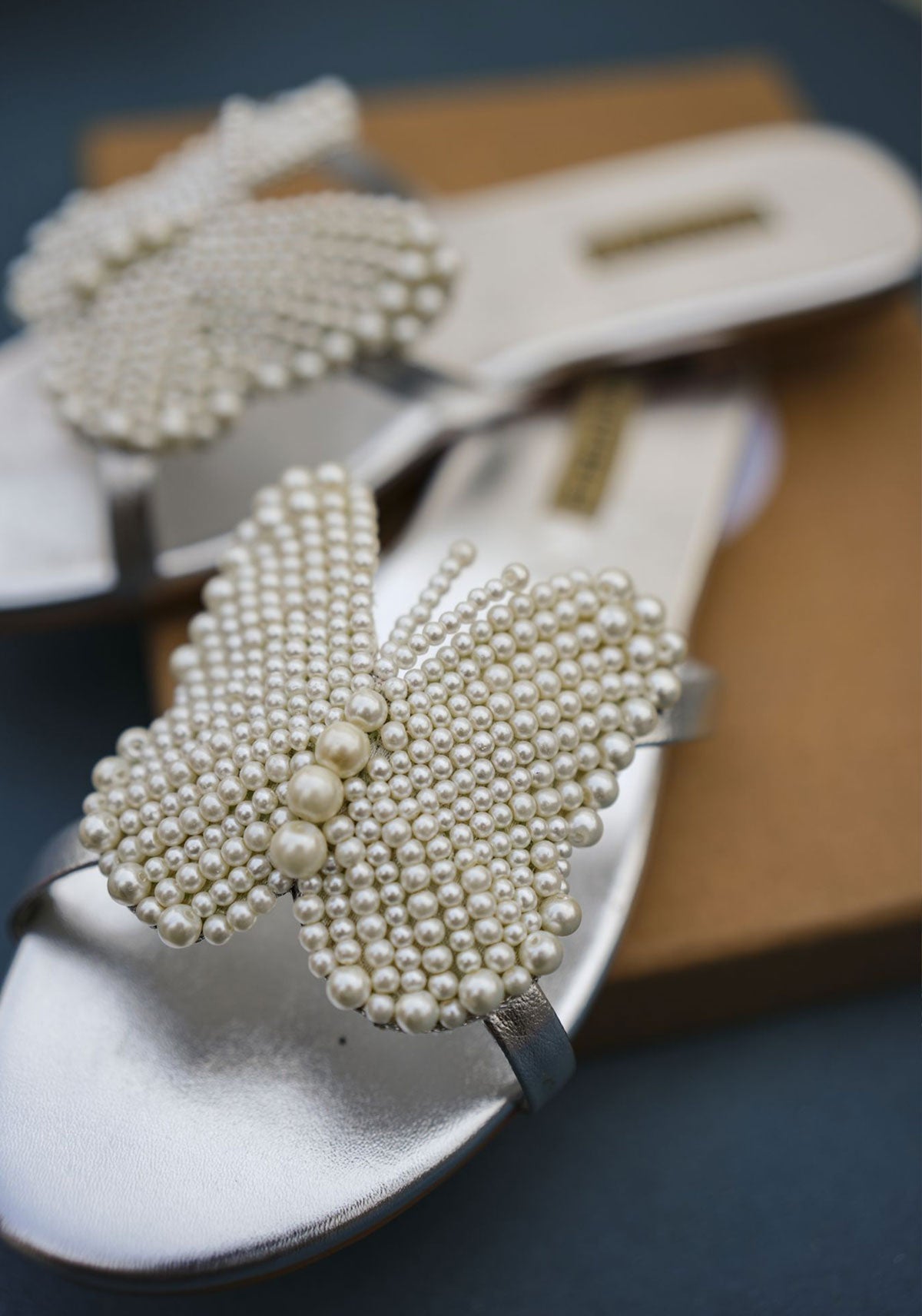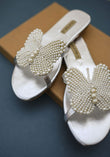Step into charm with these playful Slides featuring a hand-embroidered butterfly adorned with off-white pearls of varying sizes. The silver soft shiny rexene straps add a touch of sparkle, while the cushioned insole ensures comfort for every step. Perfect for adding a whimsical flair to your look!