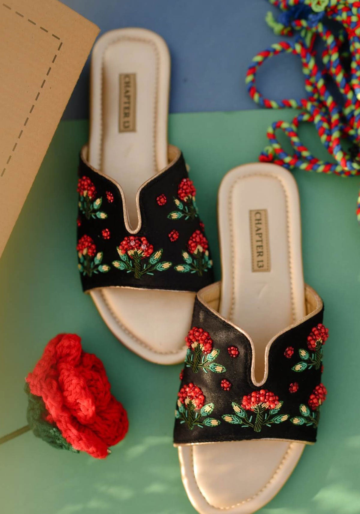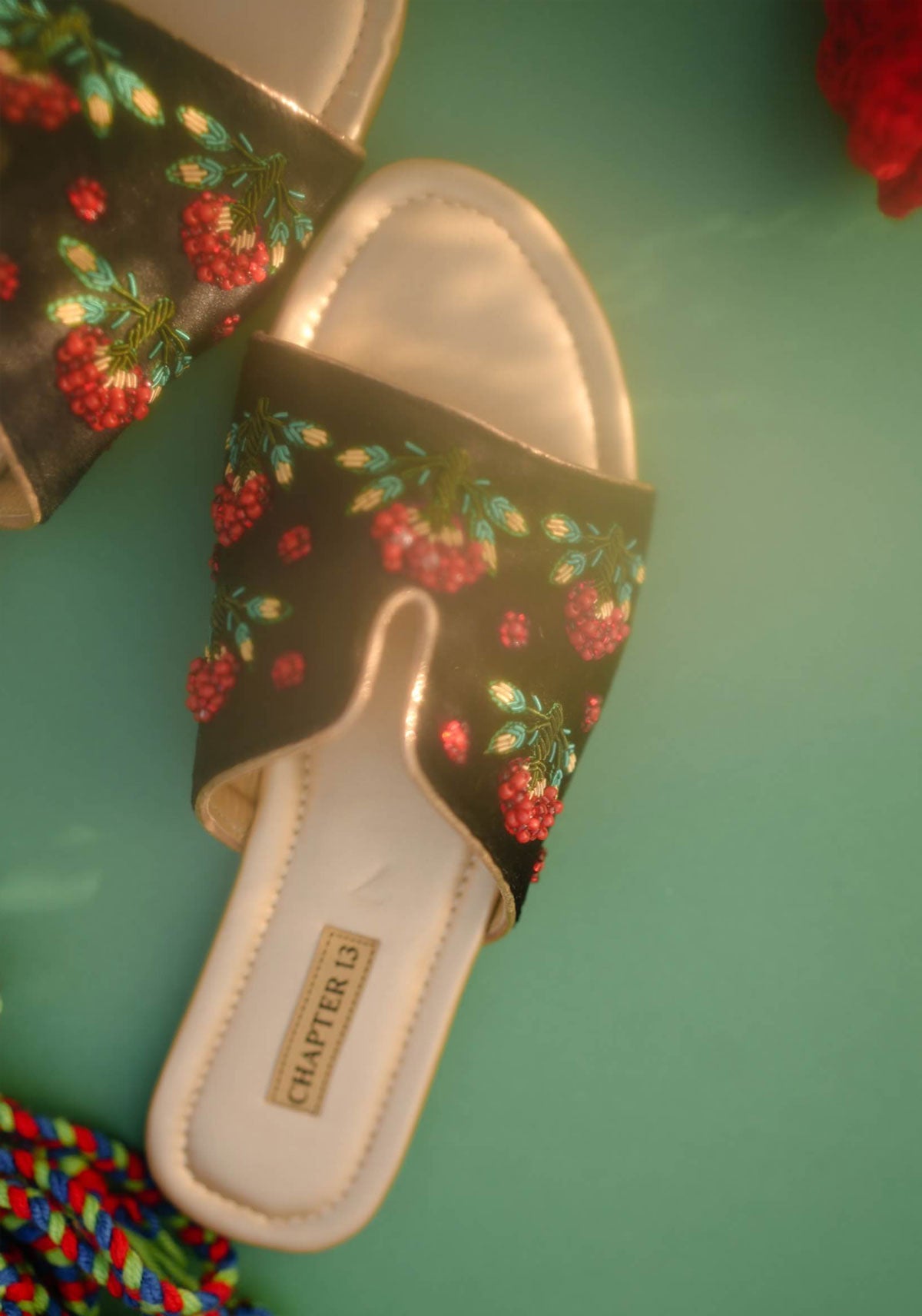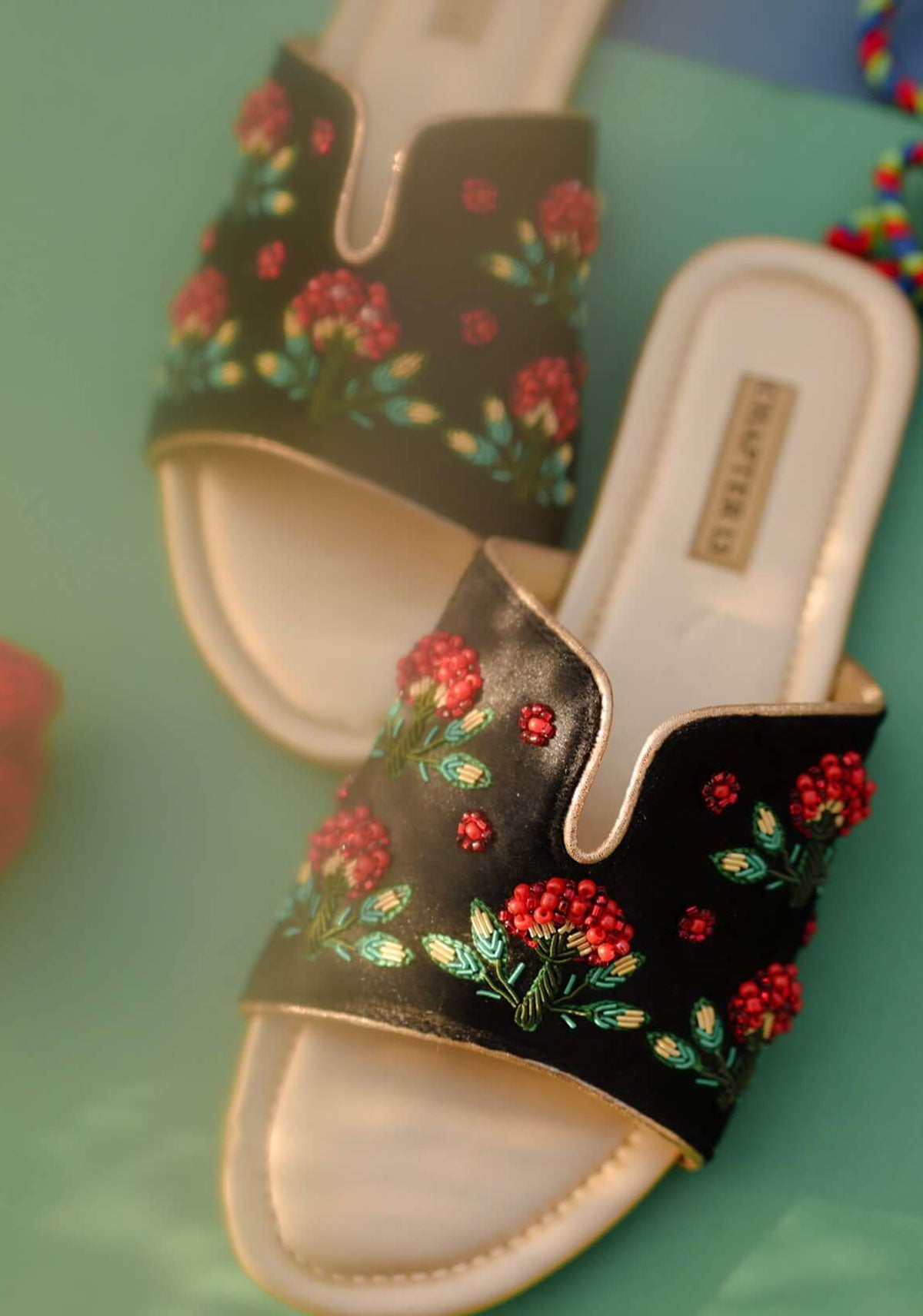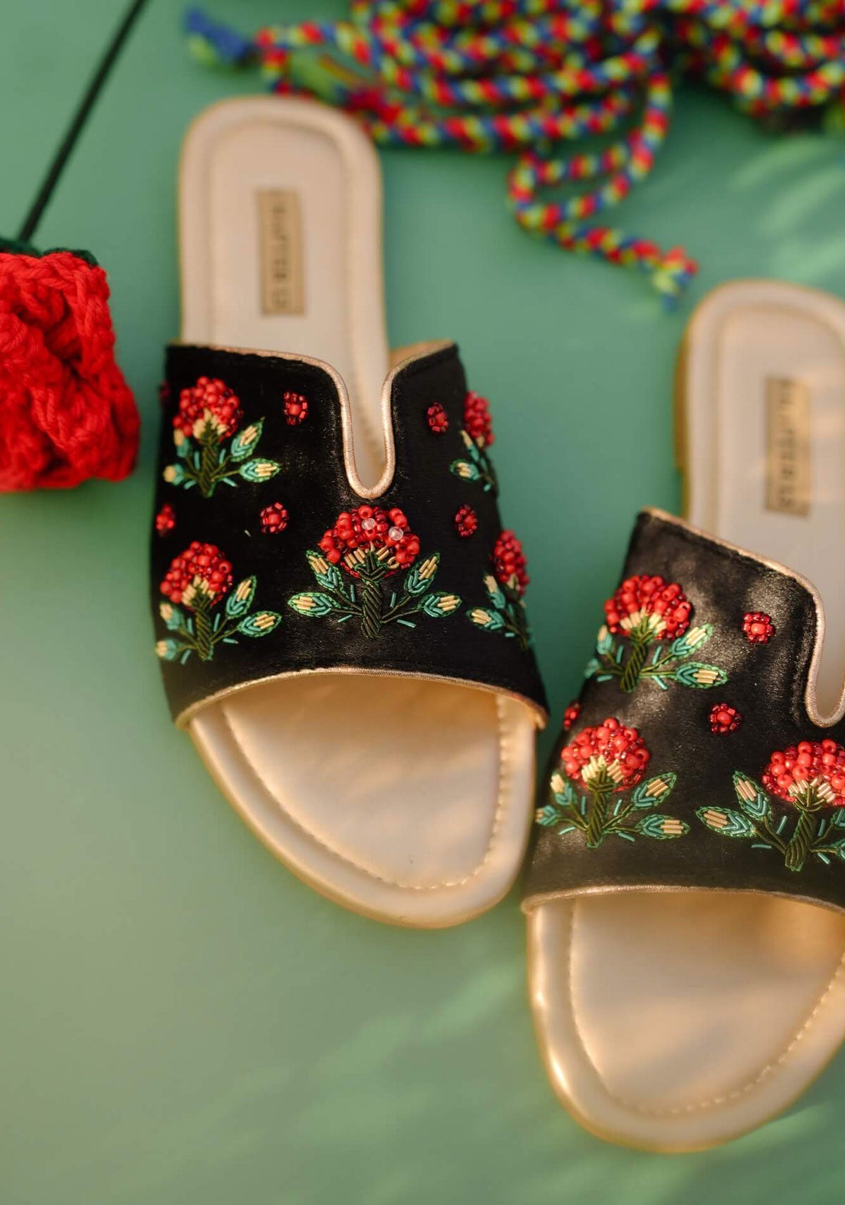 Step into elegance with Shajr II, where traditional craftsmanship meets contemporary comfort. Each pair features meticulous hand embroidery in rich red tones, complemented by intricate dabka work in verdant green and lustrous gold. Delicate tree motifs dance across the surface, adorned with glittery golden piping that catches the light beautifully. The matte golden cushioned insole provides gentle support, while the lightweight crepe sheet sole ensures effortless wear throughout your day. A stunning fusion of artisanal detail and wearable luxury.