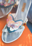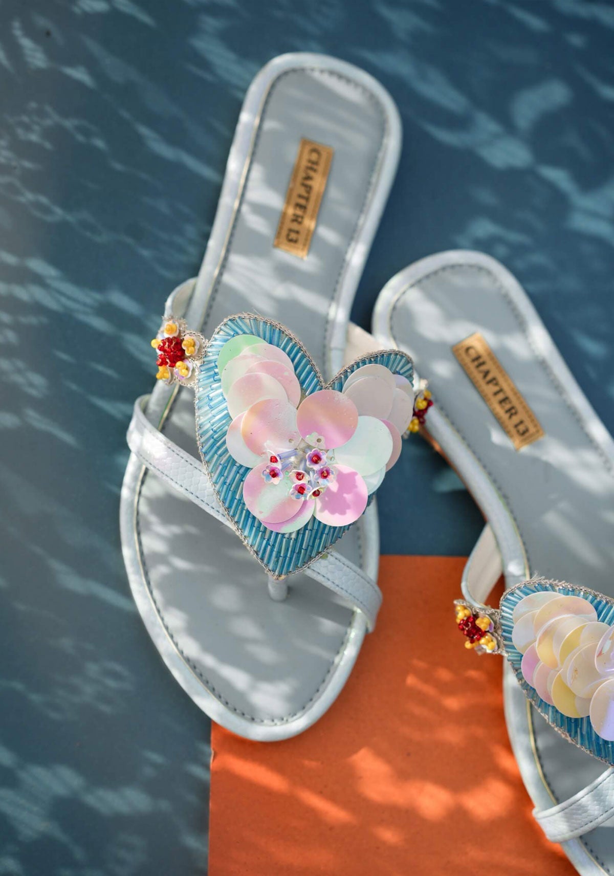 Sweetheart Steps slides combine artisanal charm with everyday comfort. Each pair features hand-embroidered heart shapes adorned with shimmering blue glass pipes and 20 size reflective white palettes that catch the light beautifully. Delicate flower-shaped sequins accent the sides, complemented by eye-catching 3D red and yellow beads for dimensional detail. Neon textured rexene straps on the upper and lower sections add a modern edge to this whimsical design. Step into comfort with a cushioned insole and durable dull blue base.