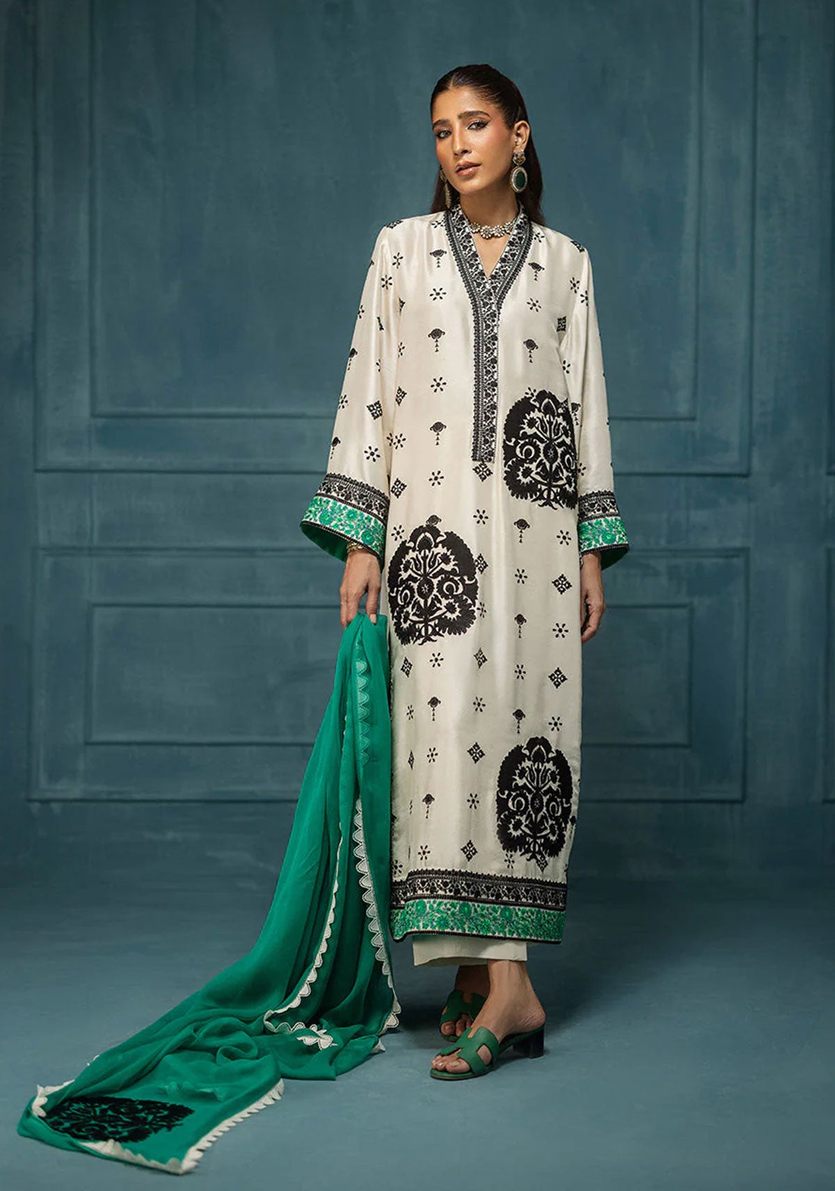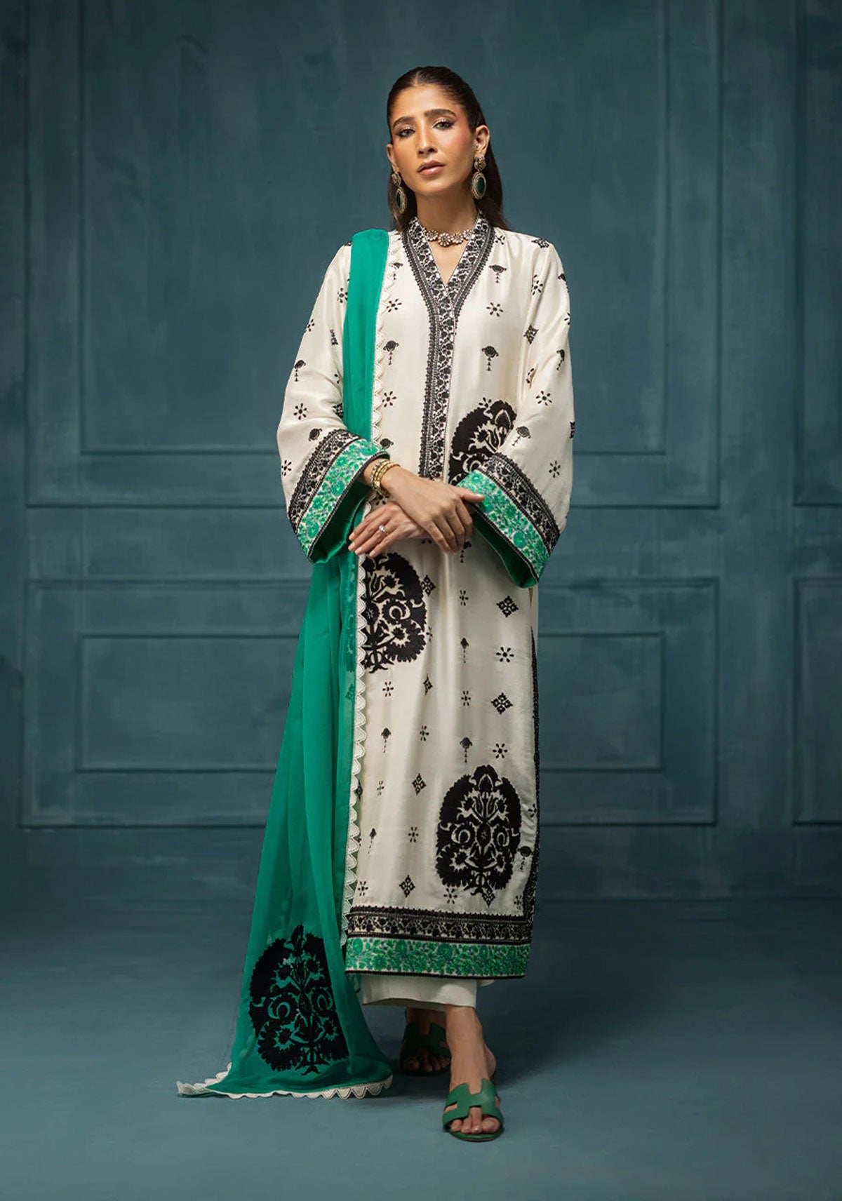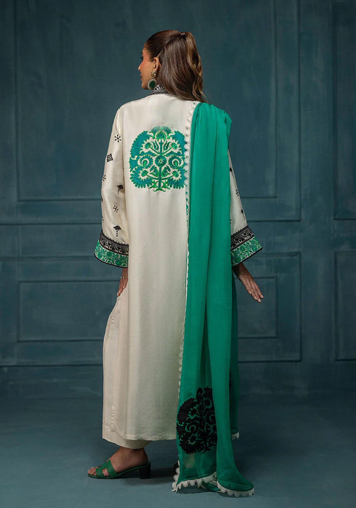 Crafted from luxurious raw silk, this stunning ivory ensemble is a timeless addition to any wardrobe. The full-length shirt features intricate black embroidery on the front, while the back reveals a breathtakingly beautiful teal tree motif, adding an element of surprise and sophistication. A delicate scattering of embroidered motifs on the sleeves and a striking teal dupatta with embroidered bunches complete this look.