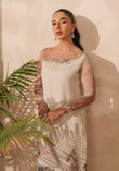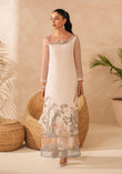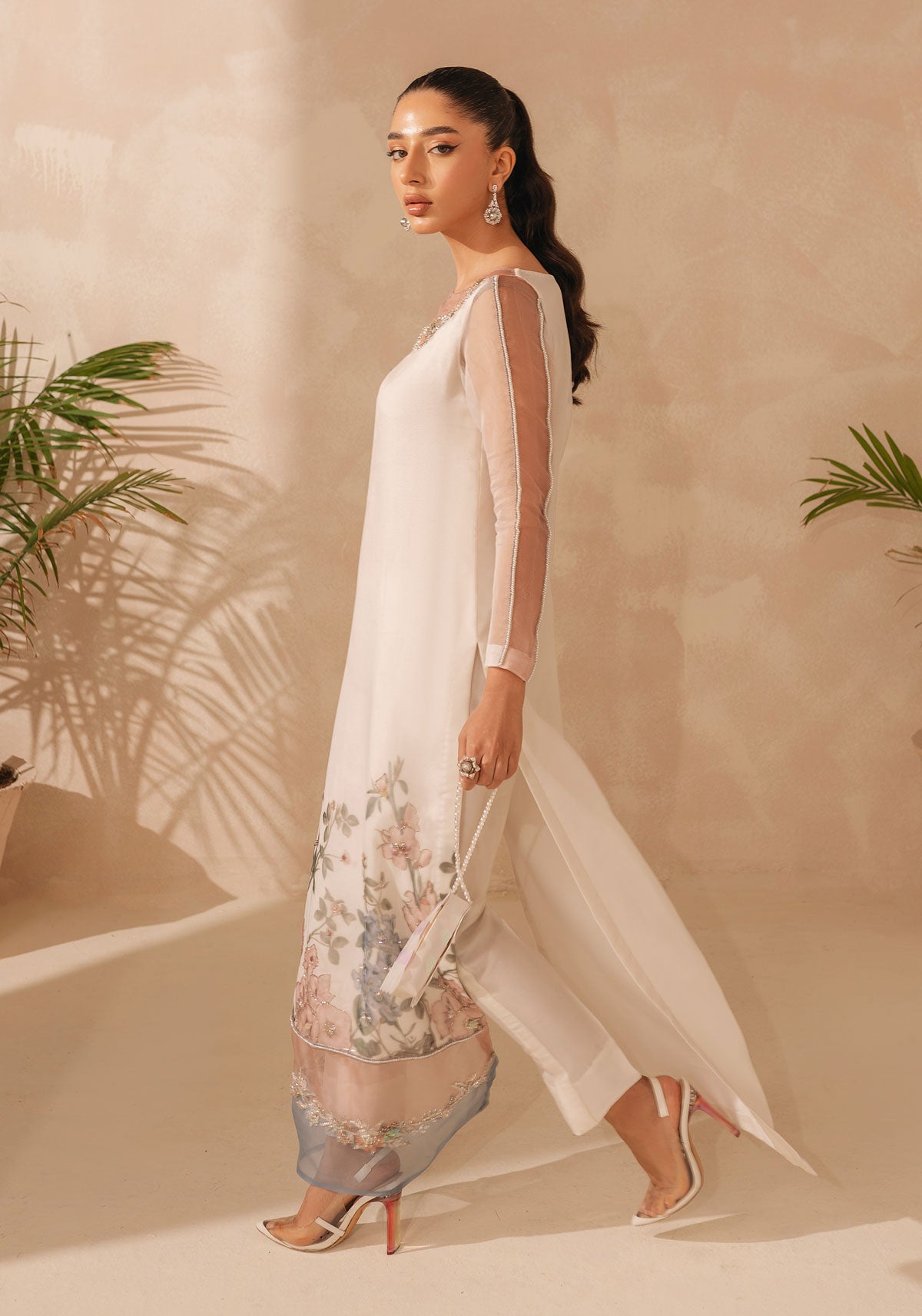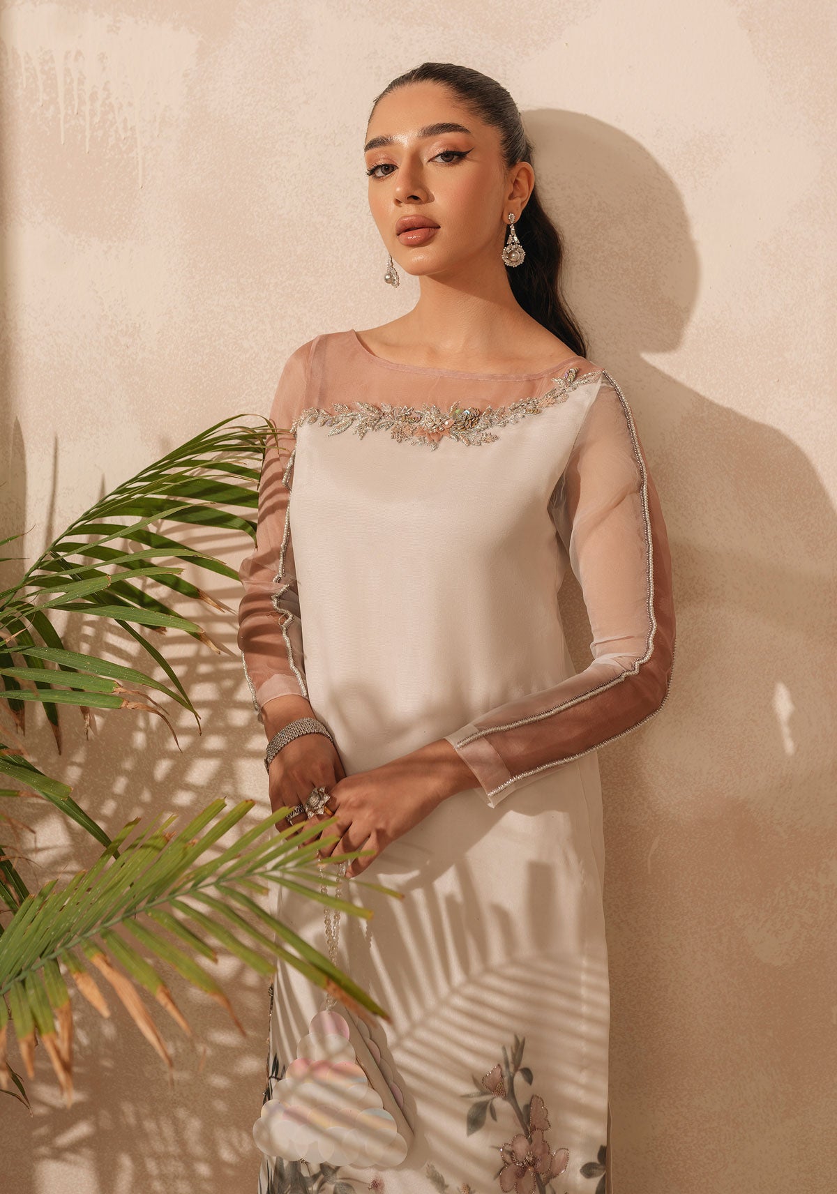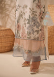 A digitally printed organza shirt with pastel hues of pink and blue in patching and print. This shirt has crystal embellishment details on the hem, neck and sleeves. This shirt is paired with silk straight pants.
