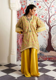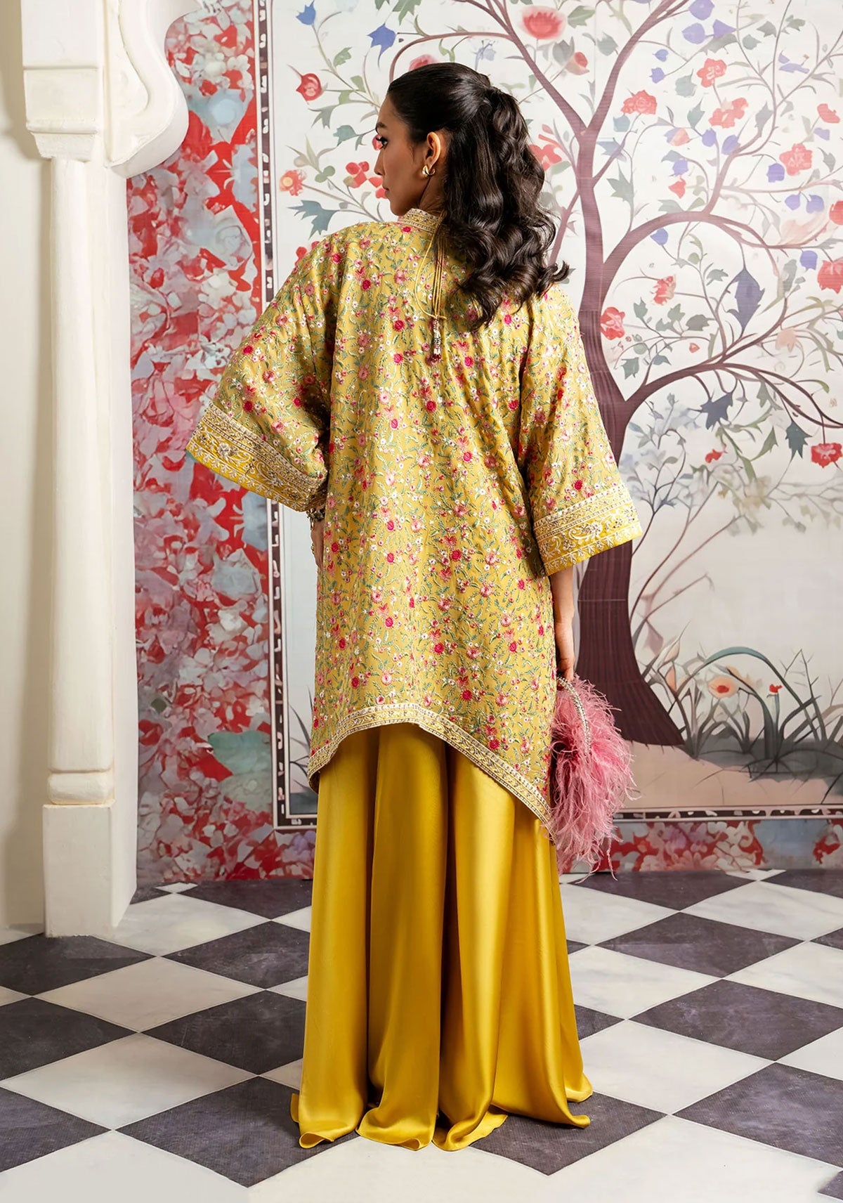 Sun Kissed from Echoes of Elara is a radiant ode to elegance in a luminous yellow hue. Crafted from airy chiffon, the long shirt drapes gracefully, adorned with intricate embroidery and meticulous handwork that adds a touch of refined artistry. Paired with lustrous satin trousers, this ensemble strikes the perfect balance between fluidity and structure.