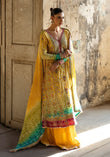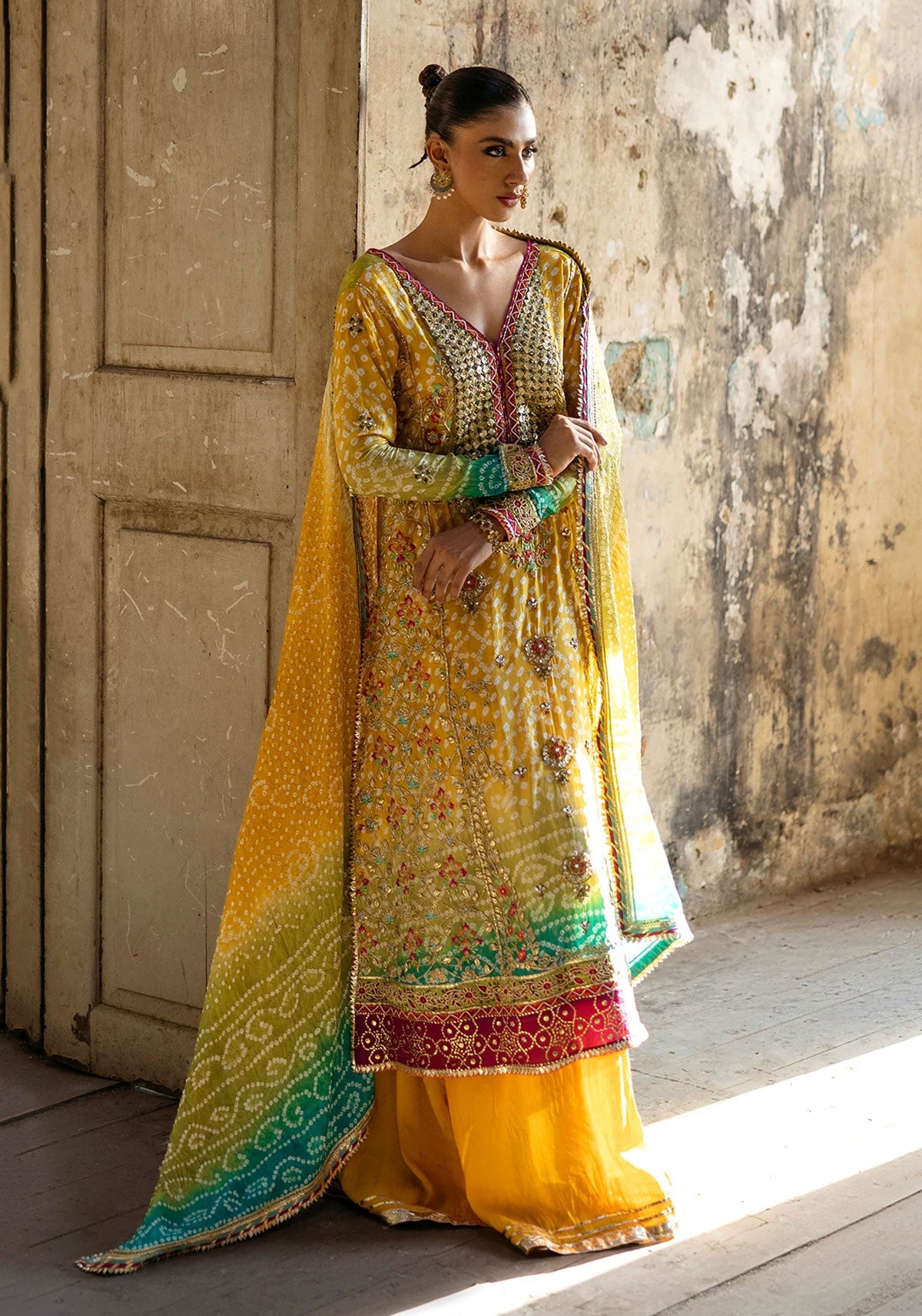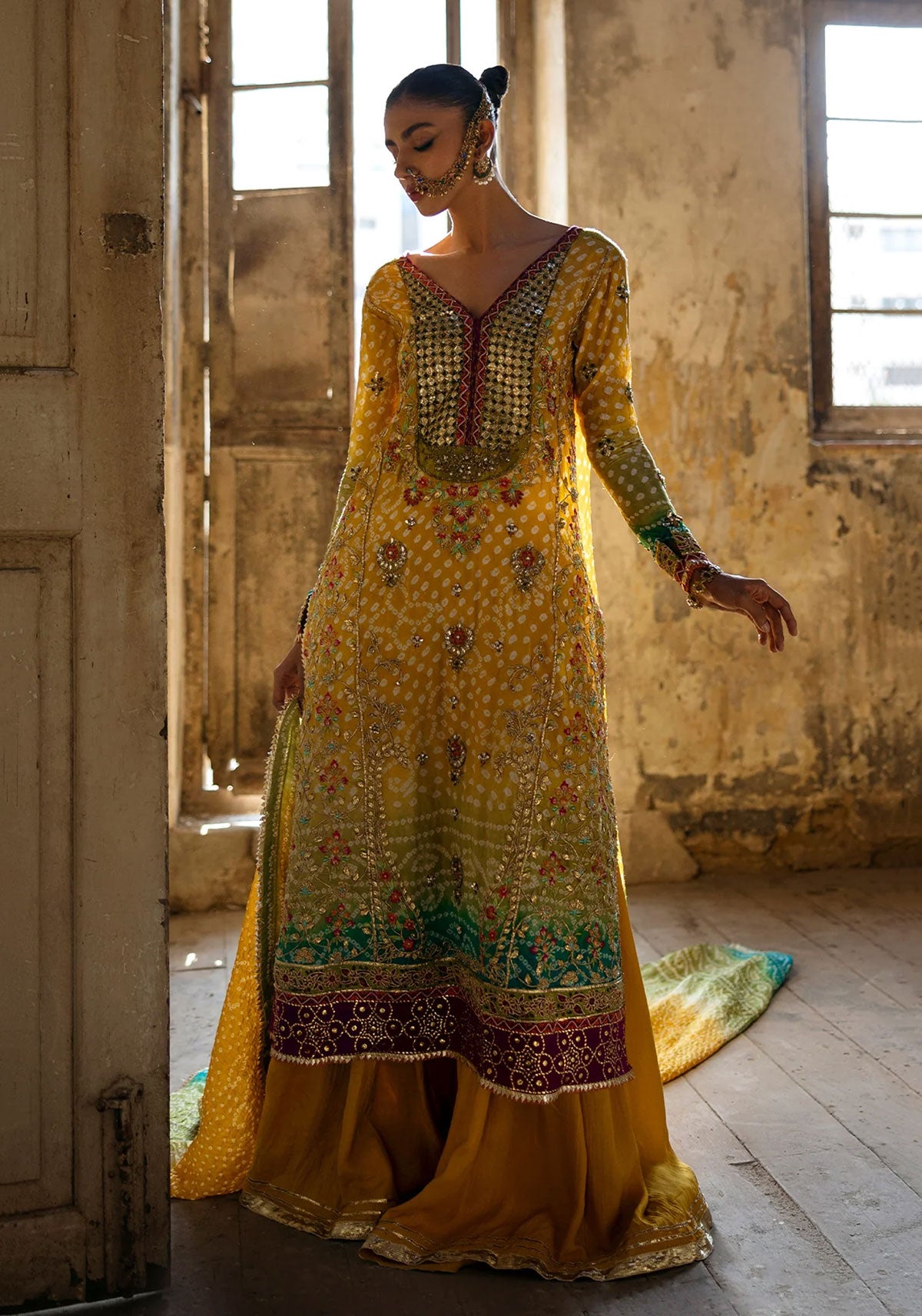 Embrace the opulence of tradition with our marigold yellow A-line kameez and sharara set. Crafted in luxurious silk, this ensemble exudes royal charm through a rich blend of classic chunri dyeing, radiant zardozi, and resham embroidery. The block-printed and kamdani borders add timeless elegance, while contrasting piping and golden gota details lend a vibrant finish. The voluminous sharara and dupatta, adorned with intricate gota lapas and kingree, complete this masterpiece an ode to heritage with a modern allure.