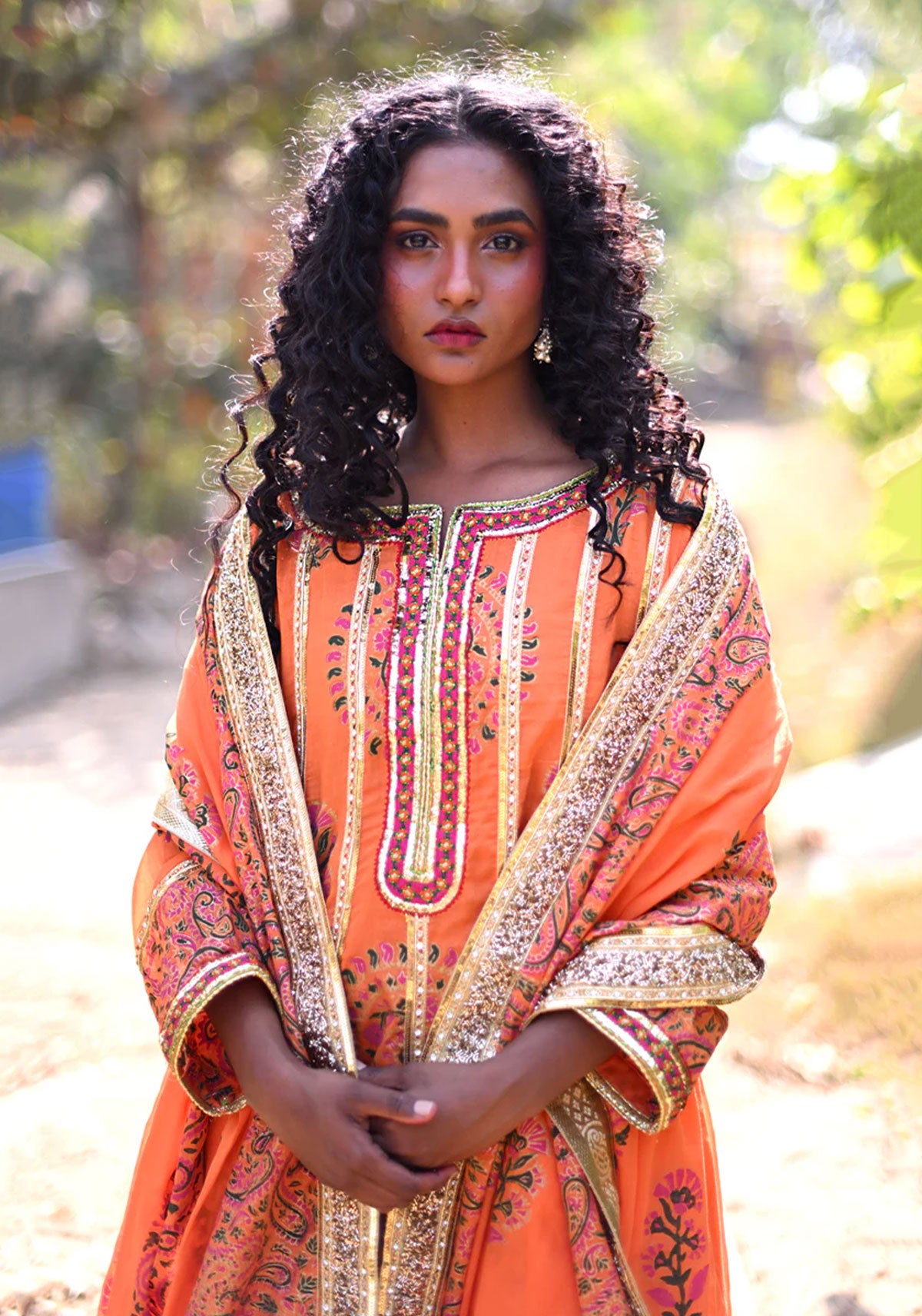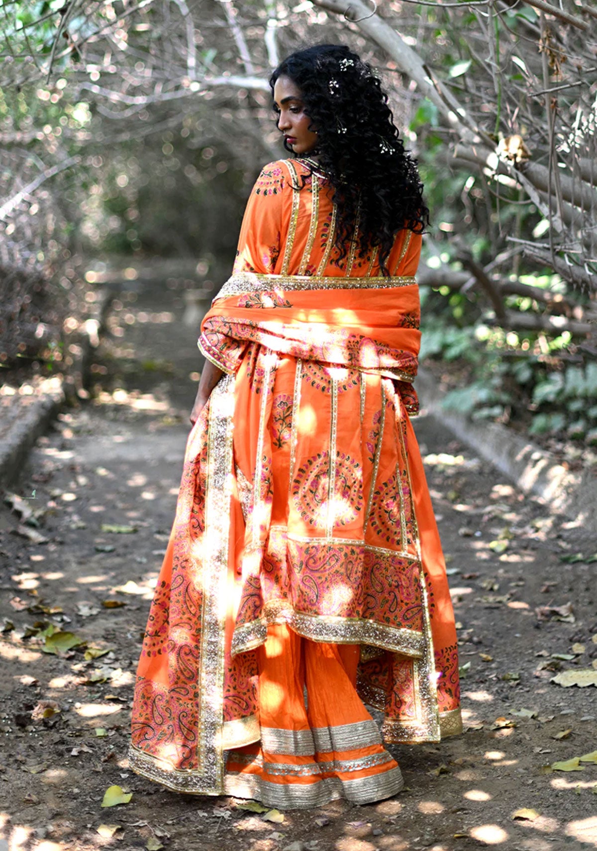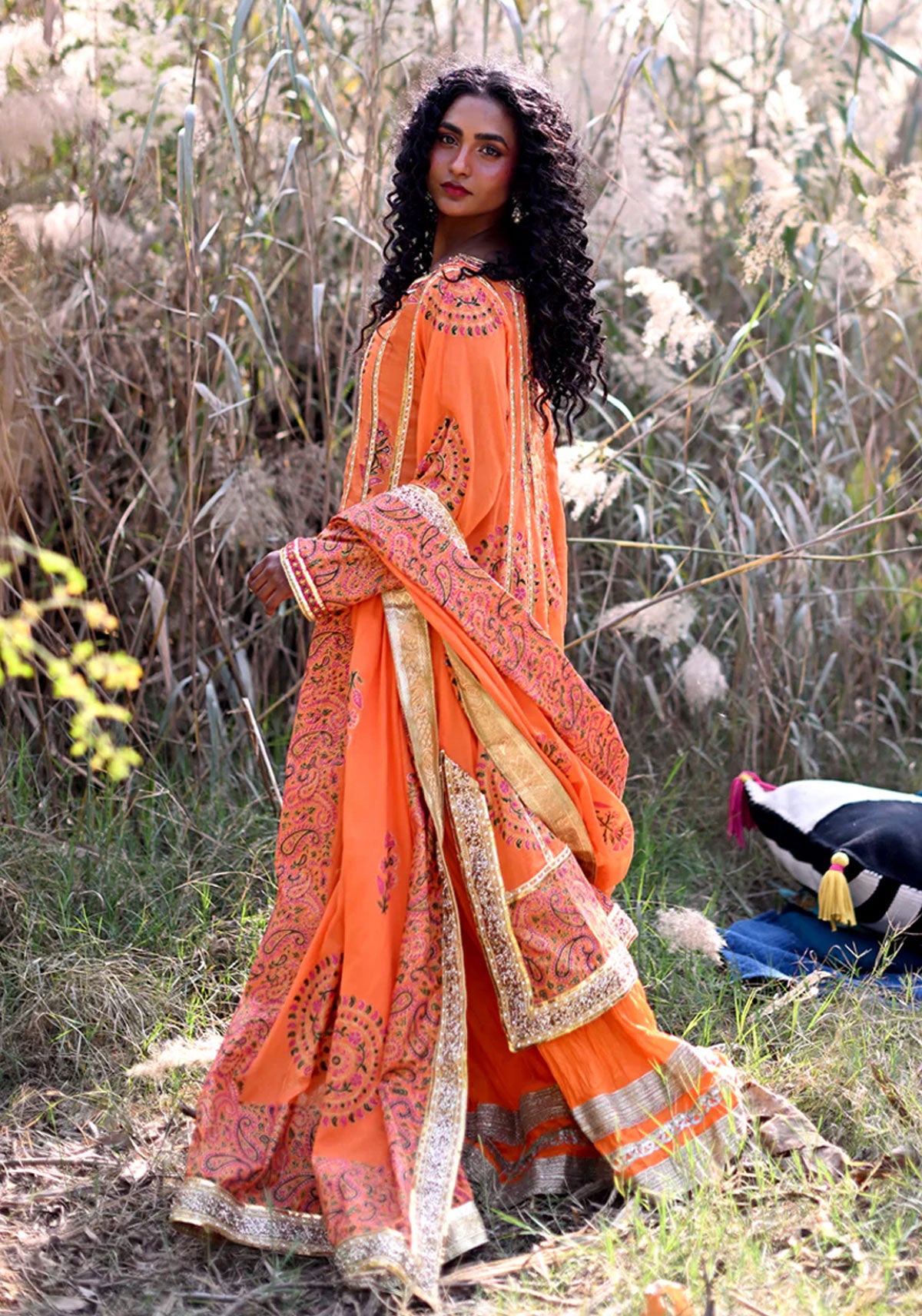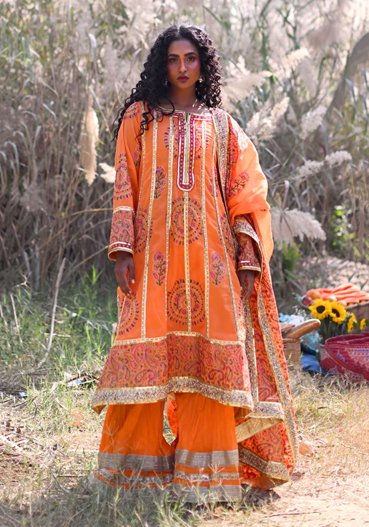 Inspired by the captivating beauty of a sunset, the “Sunset Mirage” outfit radiates warmth with its vibrant orange hue. It showcases the intricate beauty of Sindhi embroidery, bringing together timeless patterns, embellished with rich block-printed motifs, this piece features delicate patterns that evoke the colors and serenity of a fading sunset sky. The lightweight fabric offers a fluid, comfortable fit, while the flowing silhouette enhances its dreamlike quality. Finished with subtle yet elegant detailing, this outfit is paired with a matching block-printed dupatta and culottes, creating a perfect blend of bold color and graceful charm.