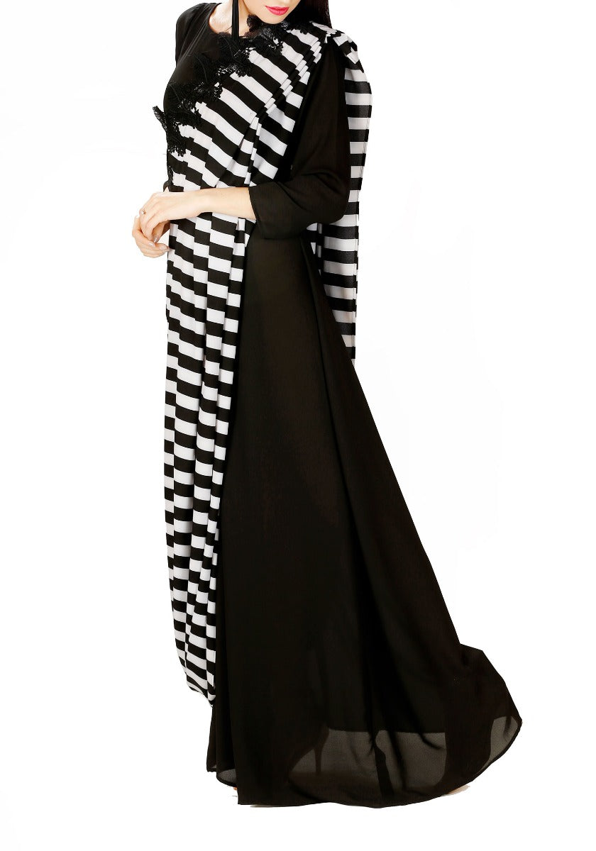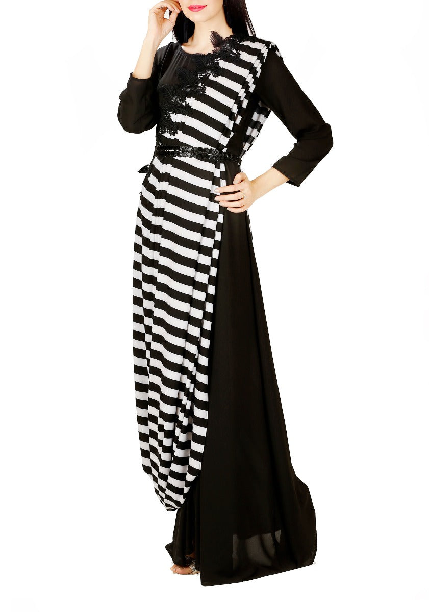 - ‘Svana’ is a sensually Draped Sari Dress exuding a modern blend of stripes with solids