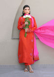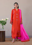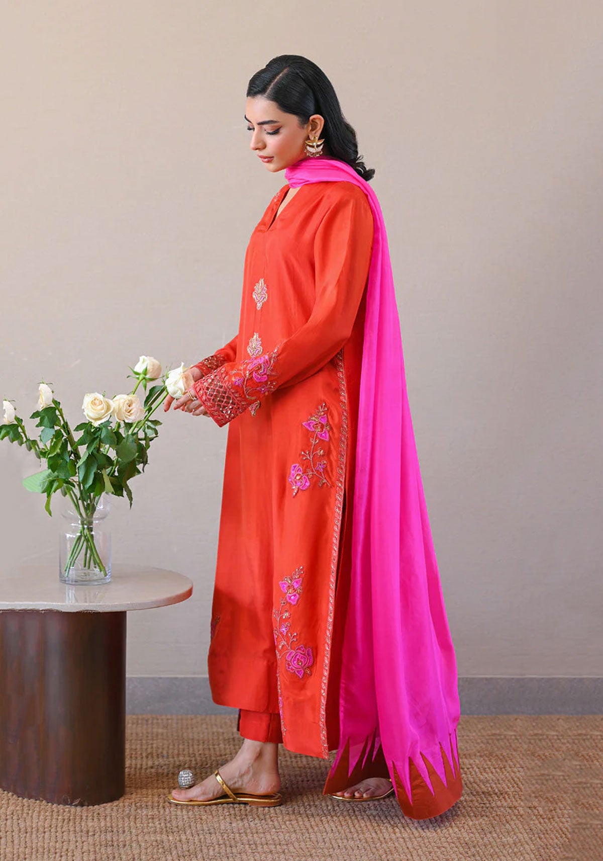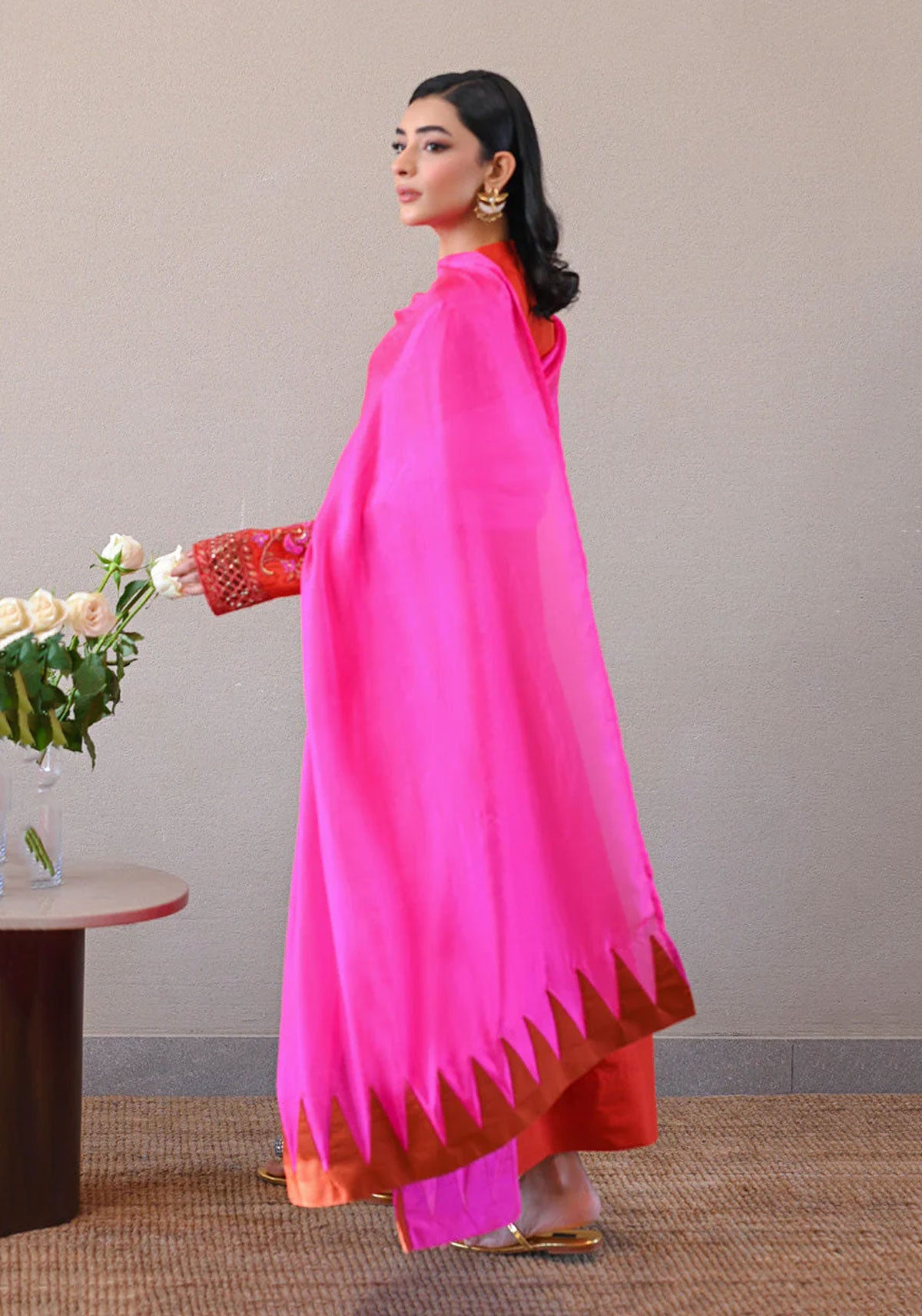 Paired with a contrasting pink dupatta, finished with rust triangle details, and matching straight pants, this ensemble demands attention, making it an ethereal masterpiece—perfect for an unforgettable Eid celebration.