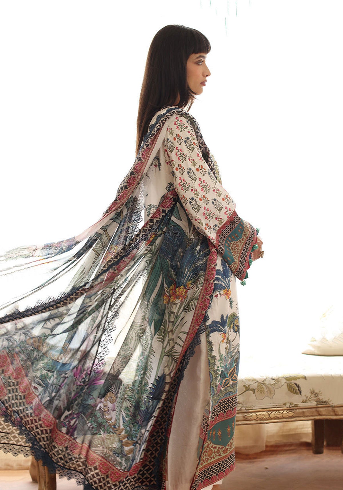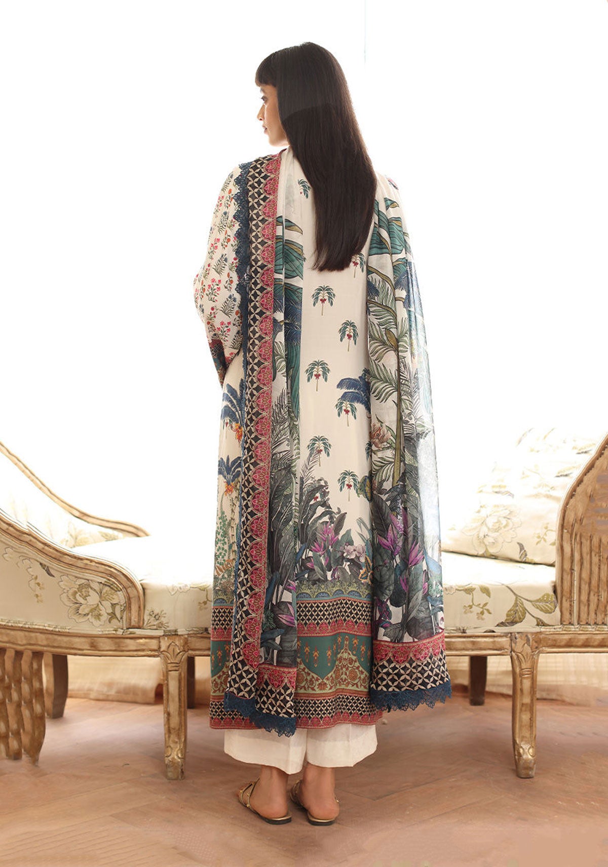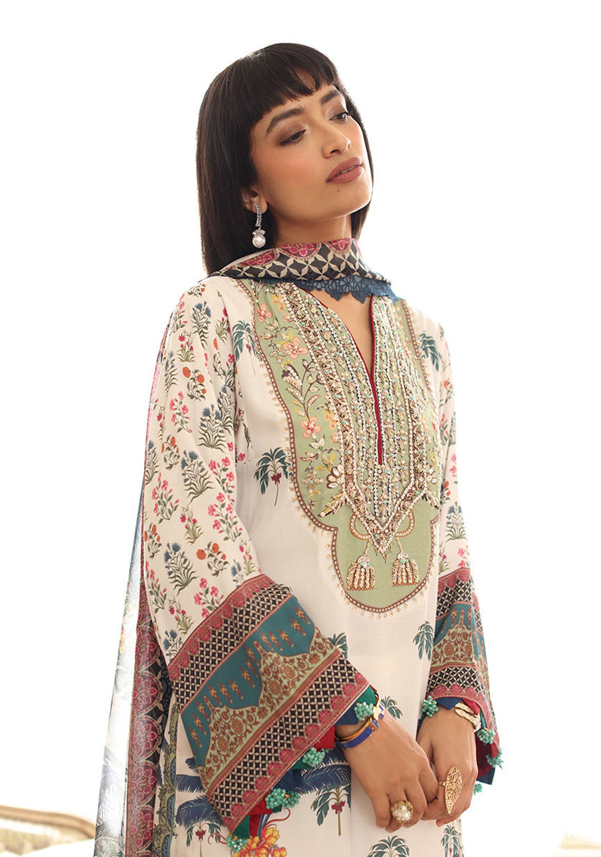 This ivory ensemble stands out with a detailed green neckline and intricate embroidery. Accented with tropical designs and colorful borders, it blends elegance with modern charm.