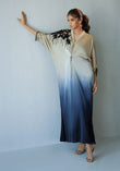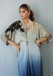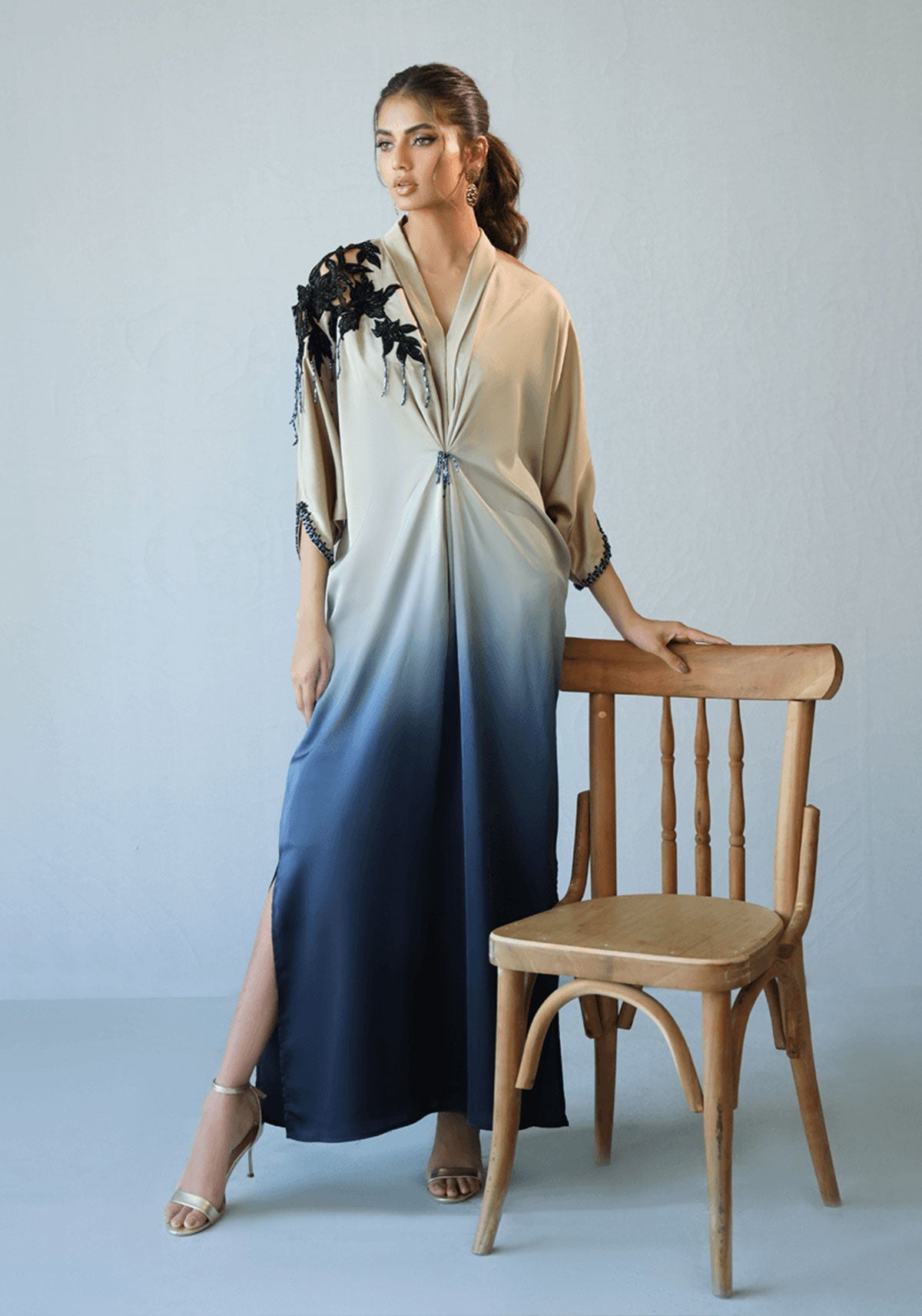 Embrace effortless elegance with this stunning tie-dye kaftan, featuring intricate floral shoulder embellishments. Designed for a graceful and modern look, this flowing silhouette combines comfort with sophistication, making it a perfect choice for festive and formal occasions.